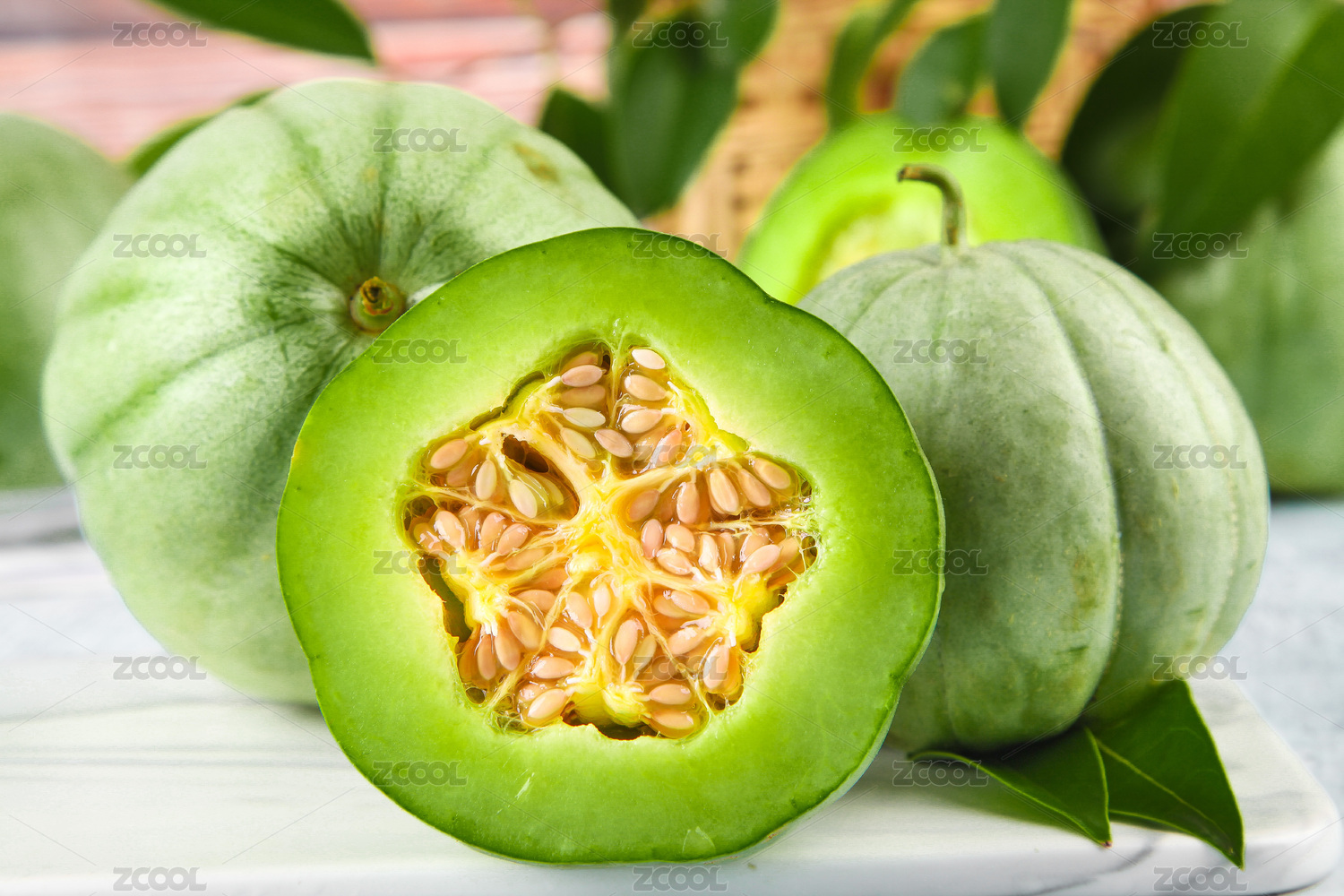 木垫子上放着绿宝石瓜和绿宝石瓜果肉