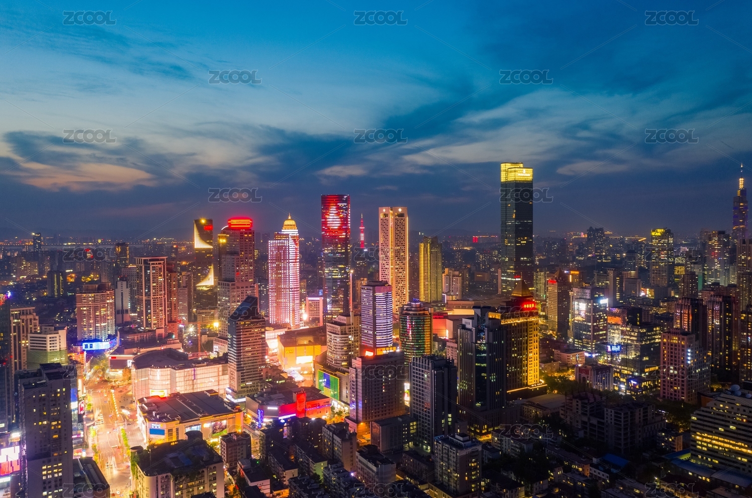 傍晚日落后的南京城市中心新街口摩天大楼天际线