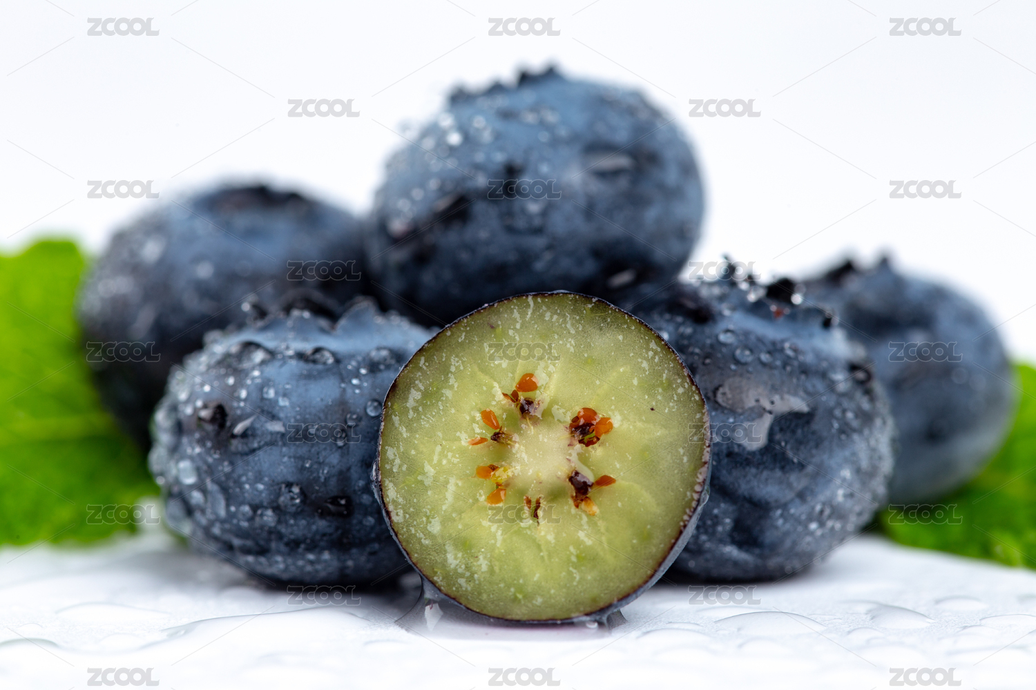 白底上放着一颗完整的蓝莓果和切开的笃柿