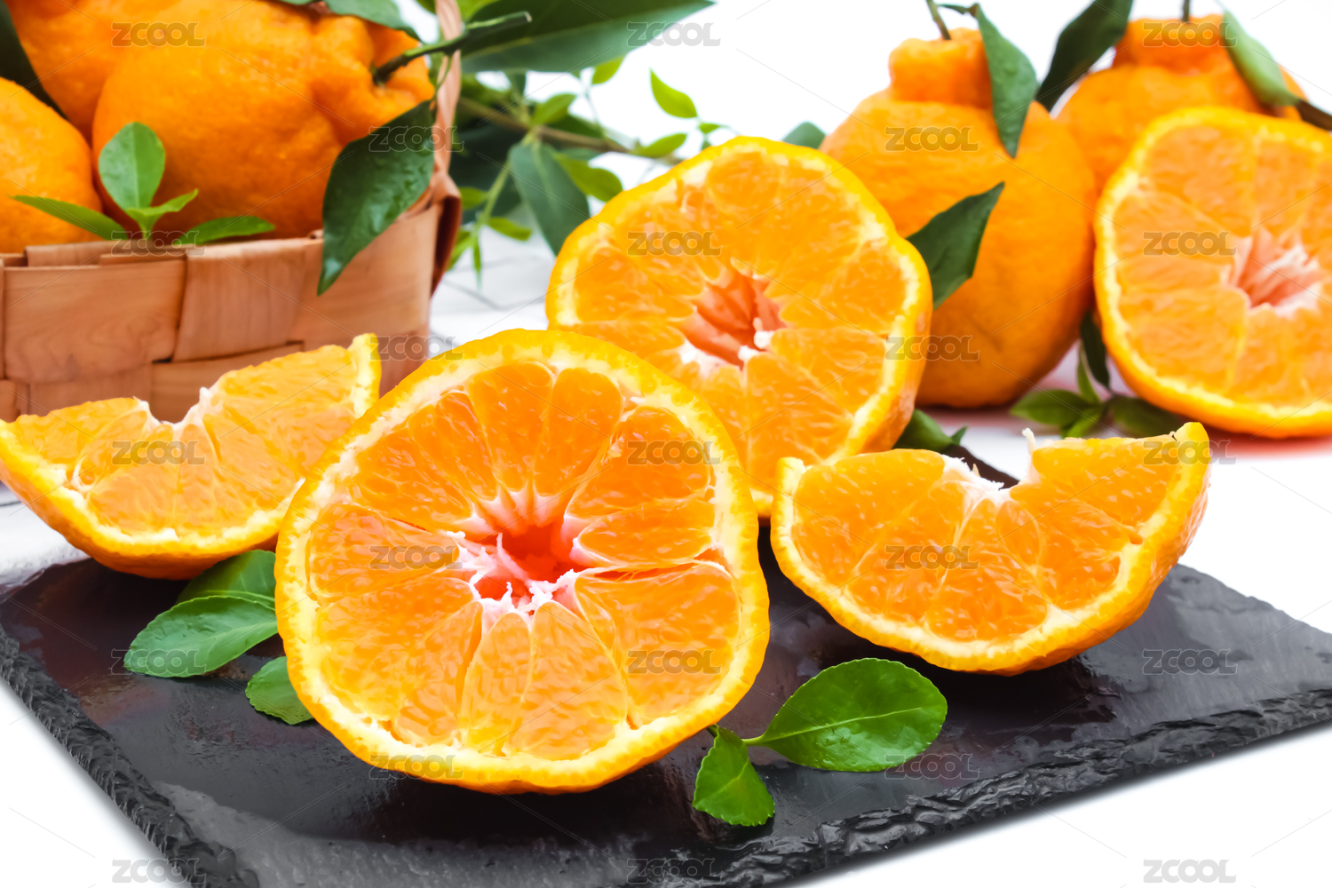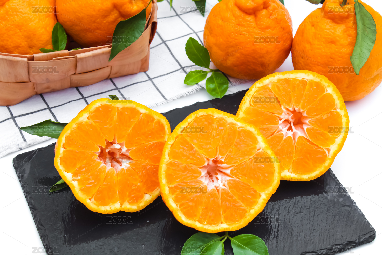 黑石板上放着两个完整的凸顶柑和切面的丑柑