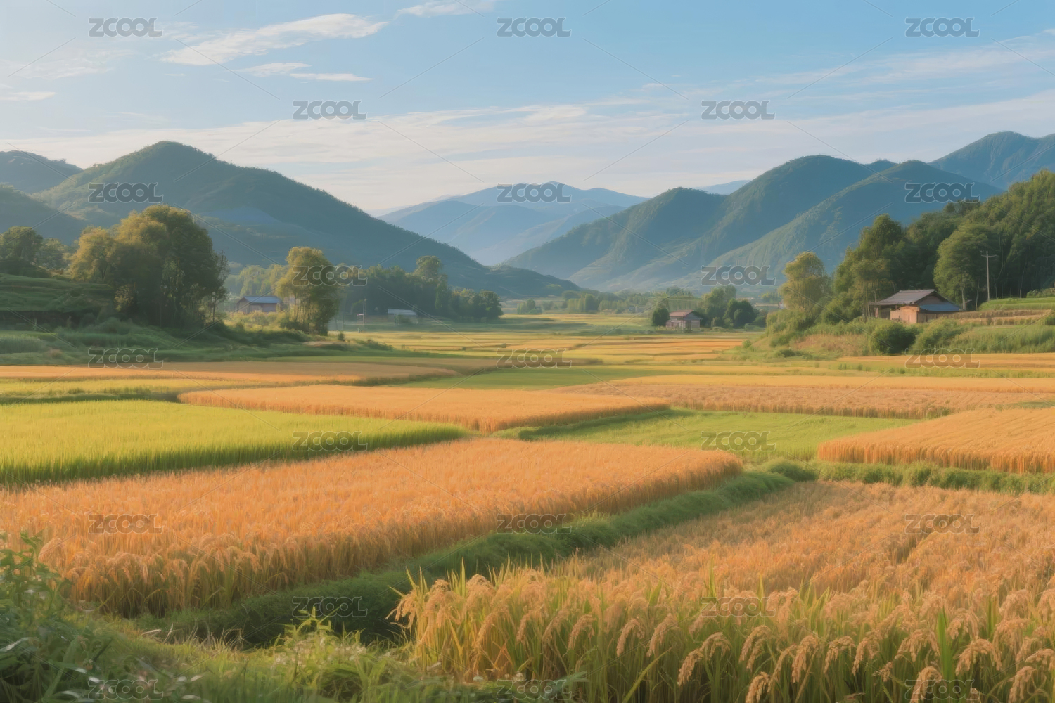 田地,水稻,干枯,收成,围栏,栏杆,废弃房子,湖水,田园,山区