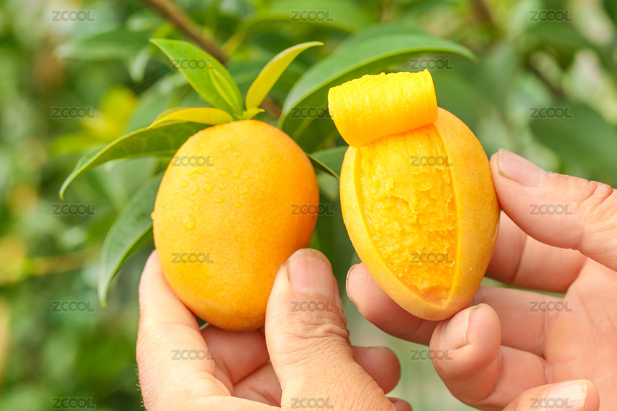 双手上拿着一个小台芒和一个撕开皮的小芒果