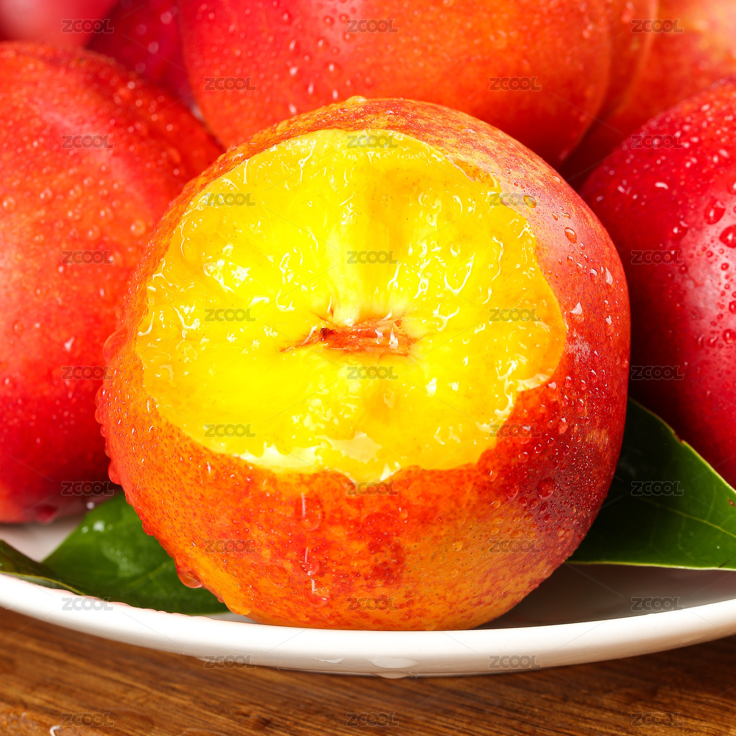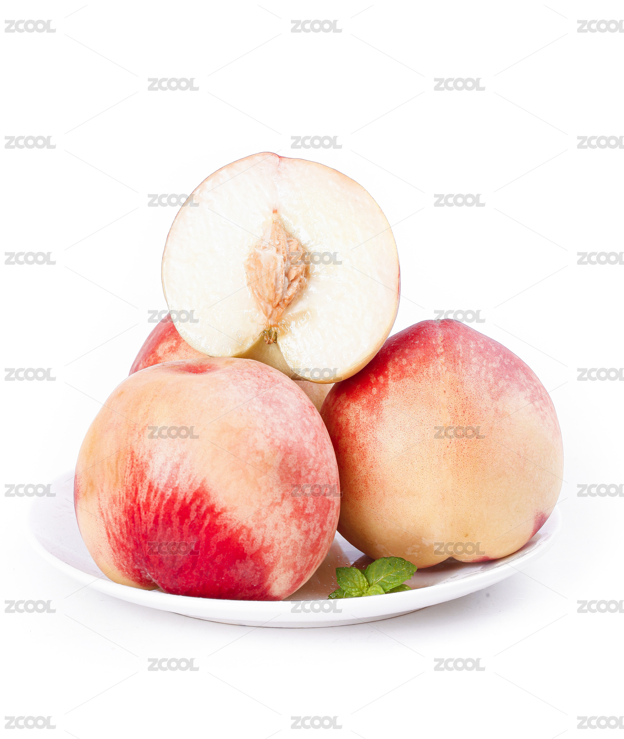 白底上的半边水蜜桃和盘子里的蒙阴水蜜桃
