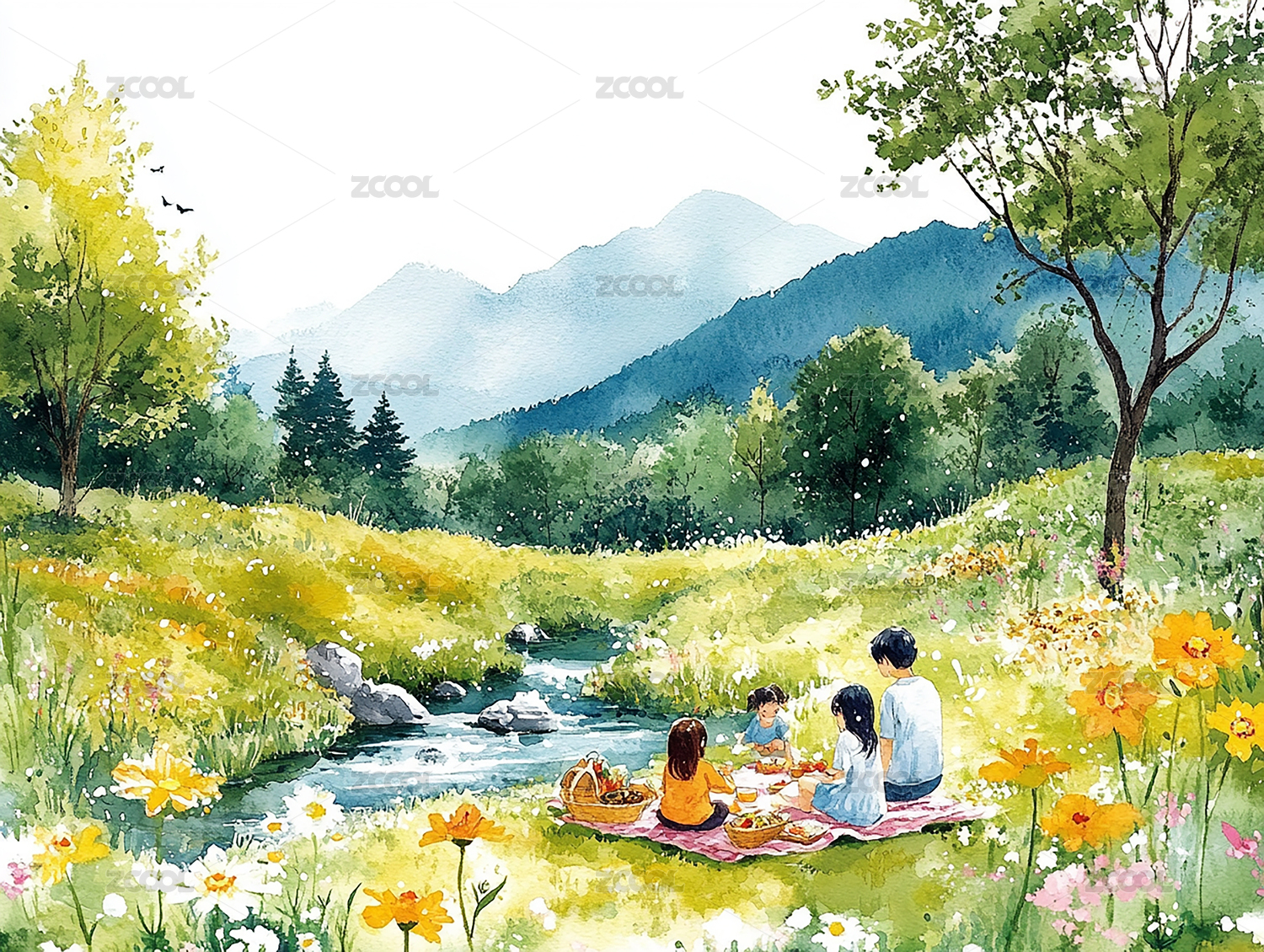 卡通手绘水彩风一家人田里抓鱼旅行插画