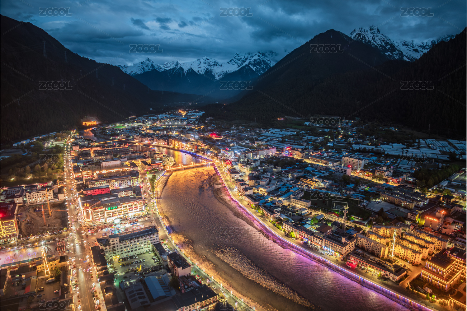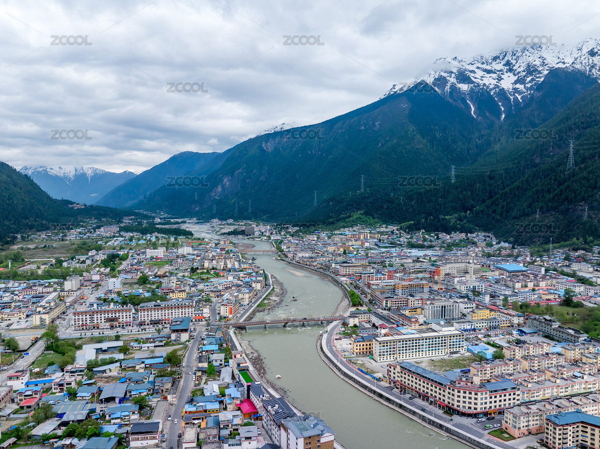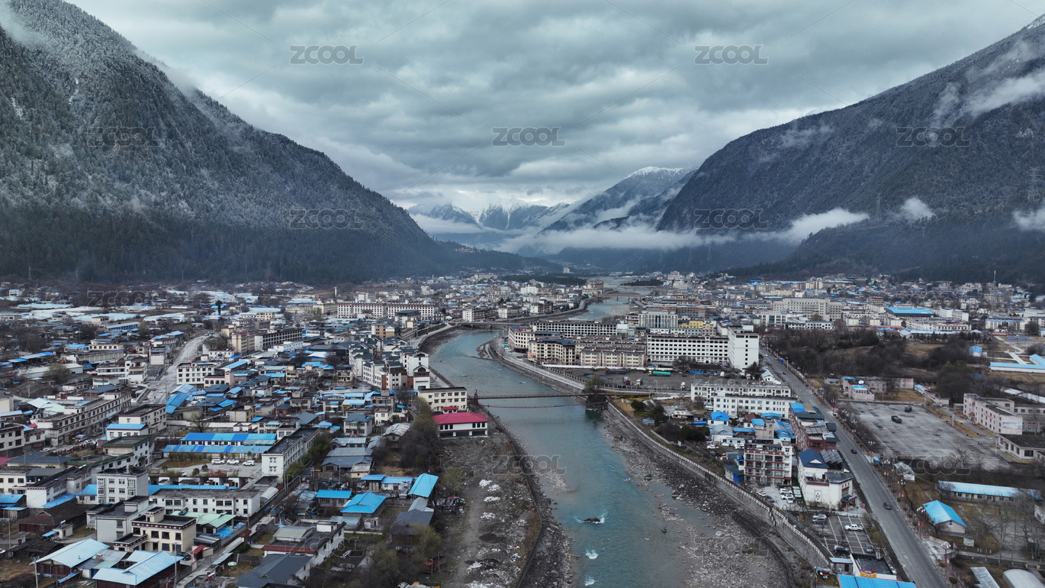 中国西藏林芝波密县城城市航拍雪山建筑风光