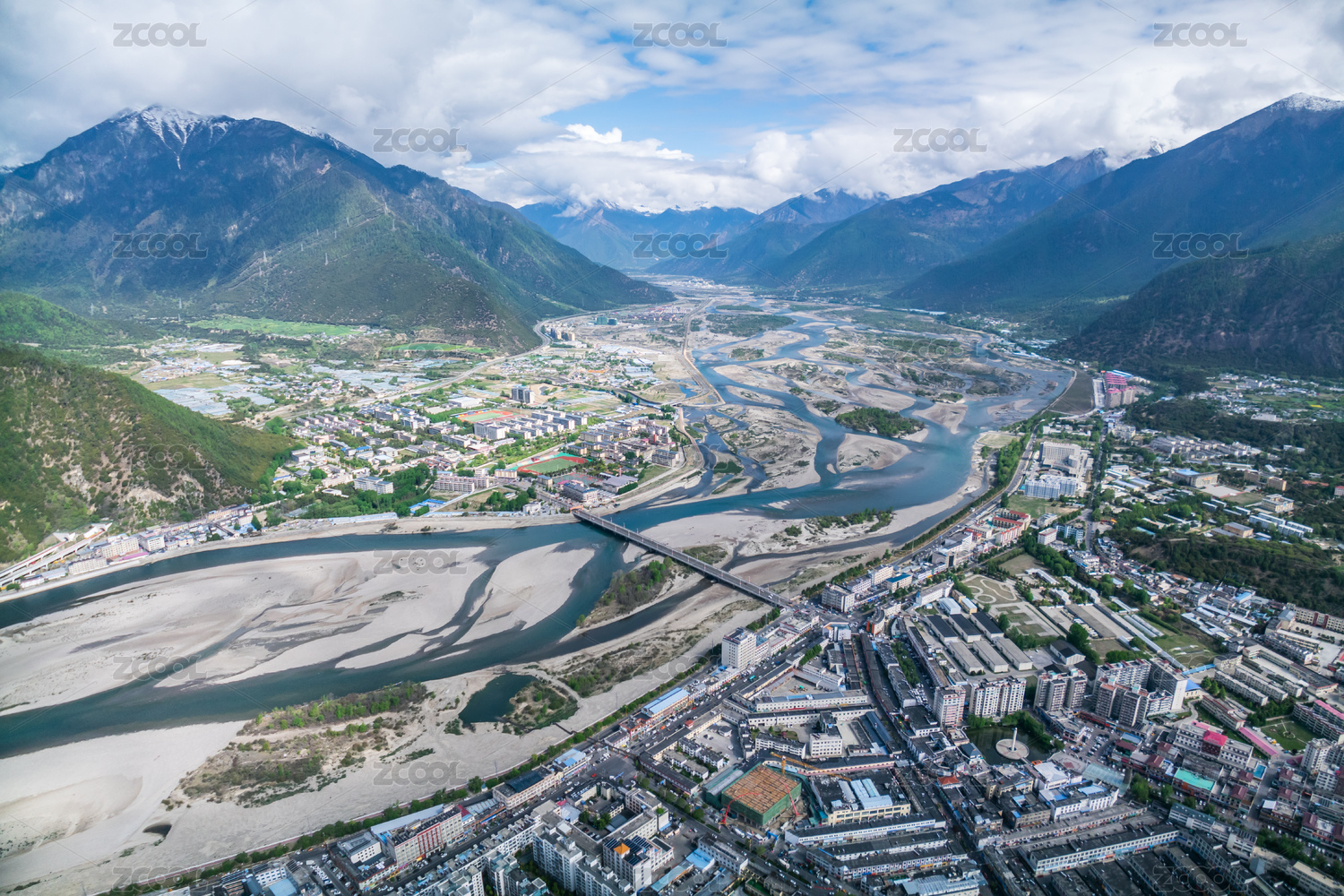 中国西藏林芝市尼洋河城市建筑风光航拍