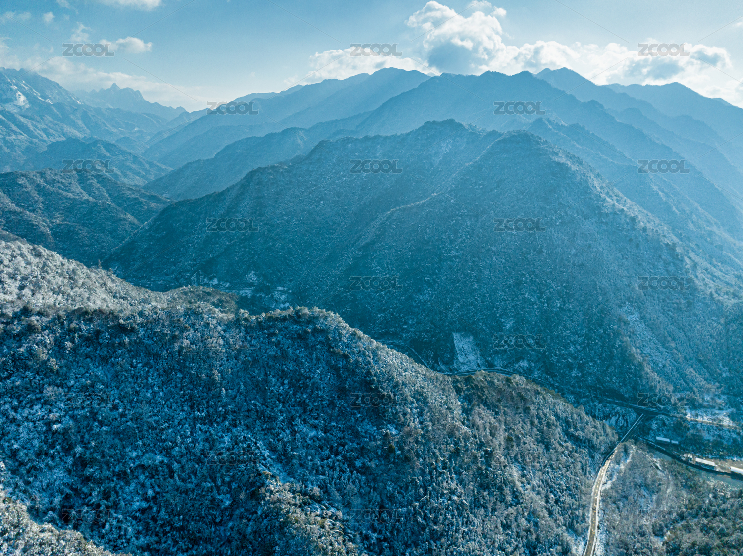 雪景雾凇,晴朗天空群山映衬着蓝天白云