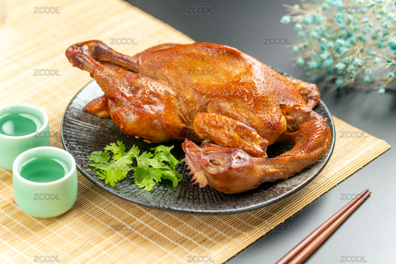 一盘整只烧鸡和酒杯摆放在黑色背景上