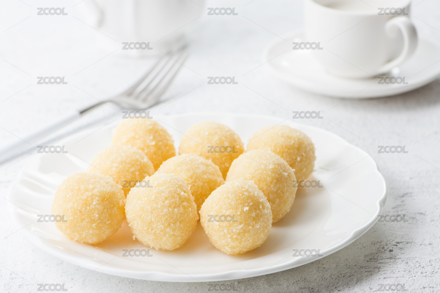 一盘制作月饼时使用的椰蓉馅料放置在水泥质感的桌面上