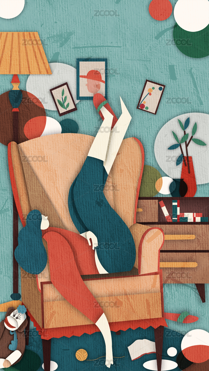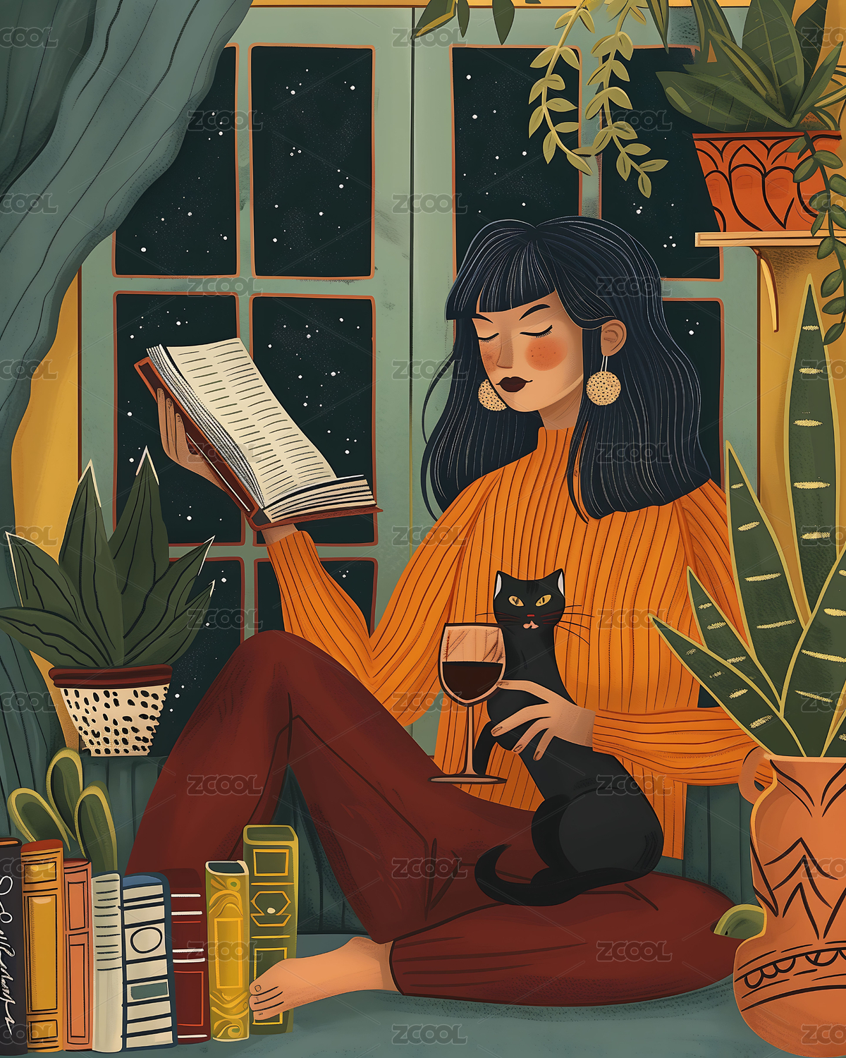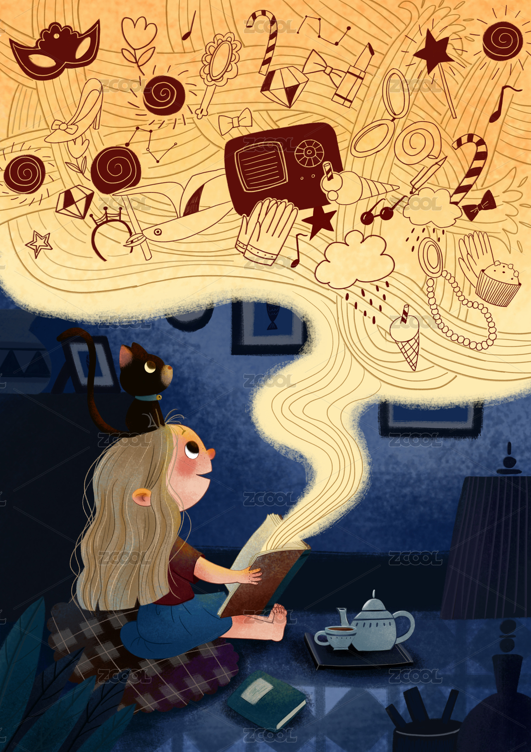 儿童插画,小女孩,室内,看书,猫,老鼠,屋内,卡通,场景,书架