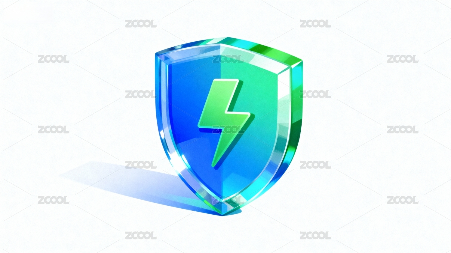 盾牌图标,闪电图标,3D图标,前视图,UI设计,蓝白配色,磨砂玻璃,透明效果,干净白色背景,科技感