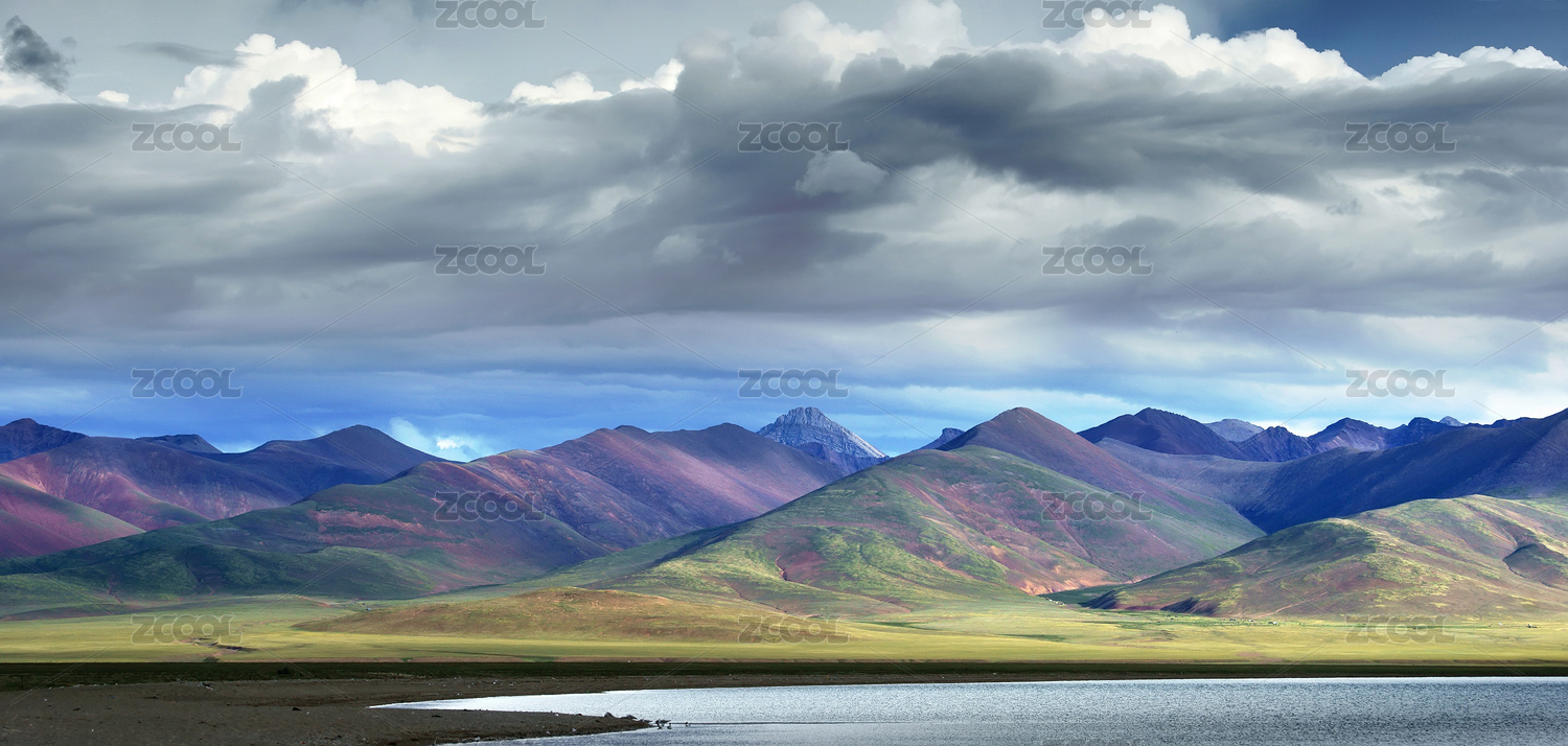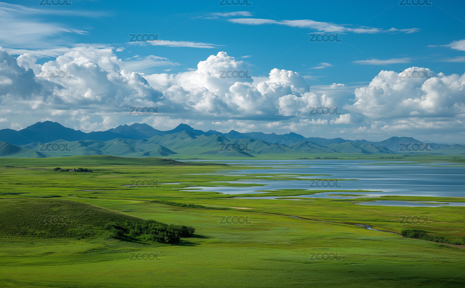 广阔草原上湖泊与河流相伴远处是山脉和云朵