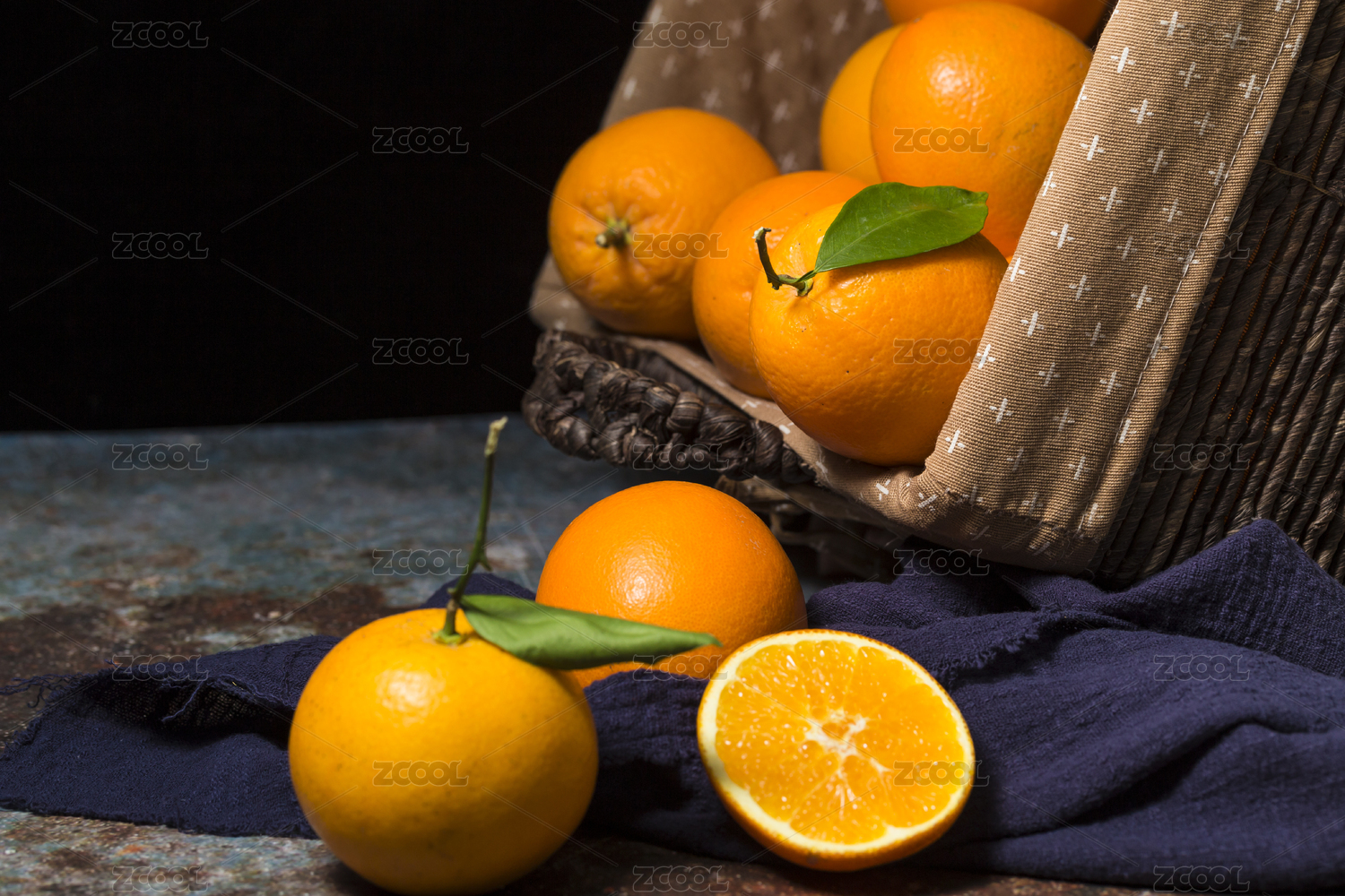 新鲜的橙子和绿色的叶子在桌子上,俯拍镜头