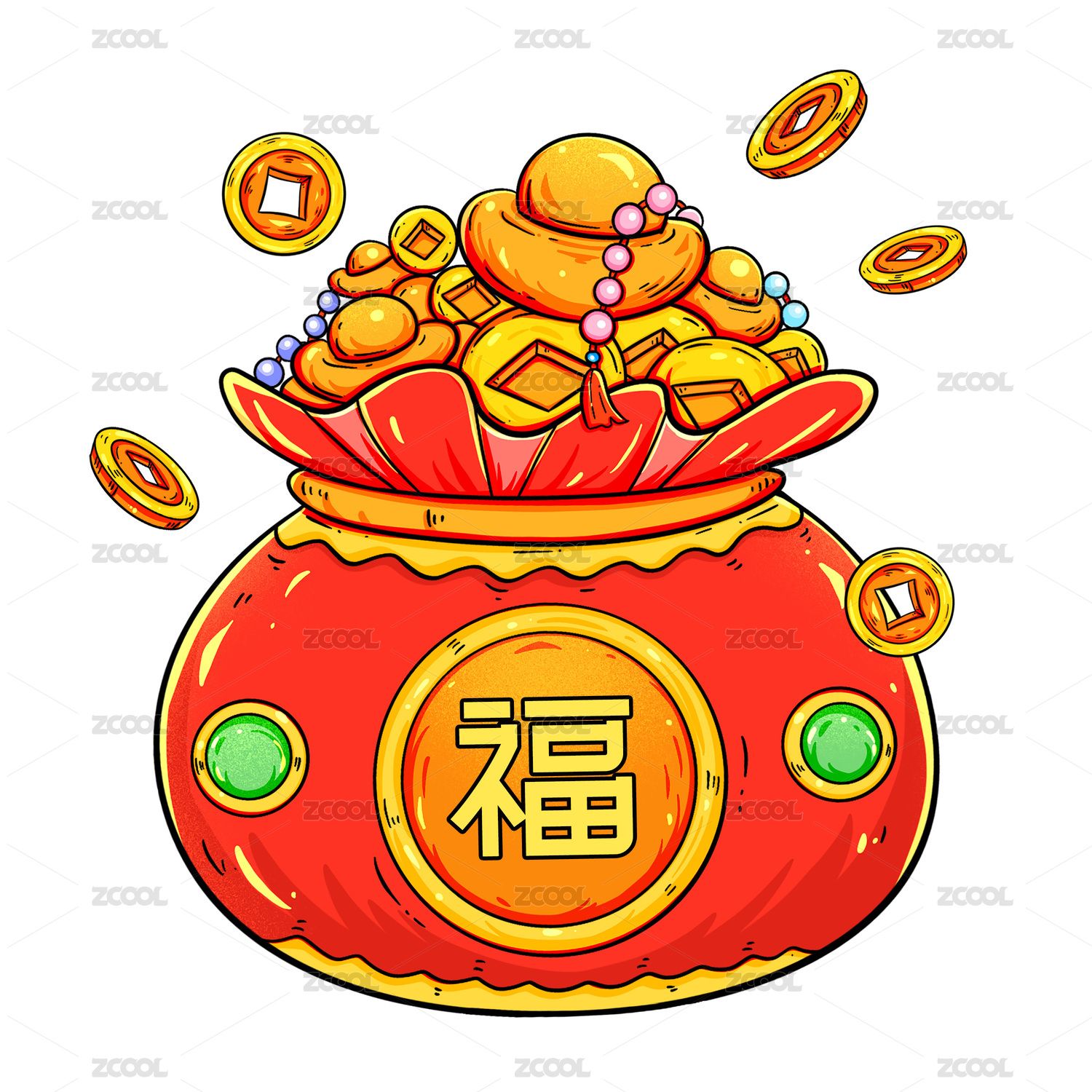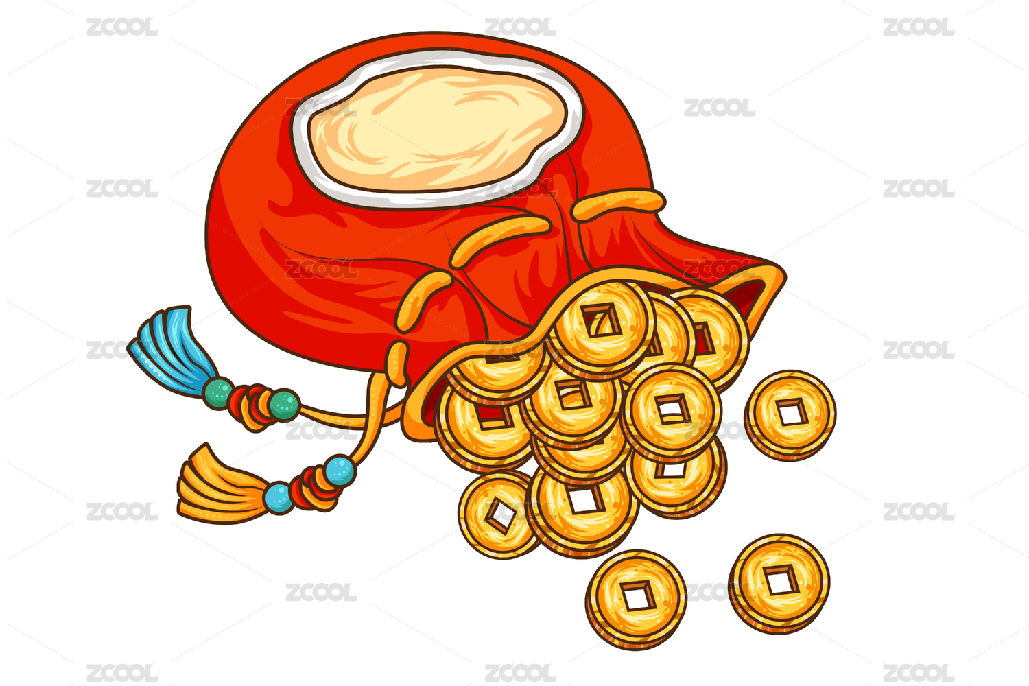 卡通矢量中国风金币钱袋福袋红包手绘插画