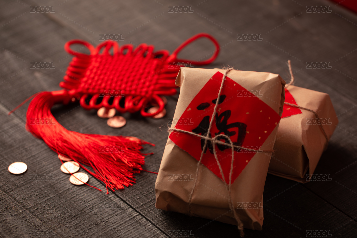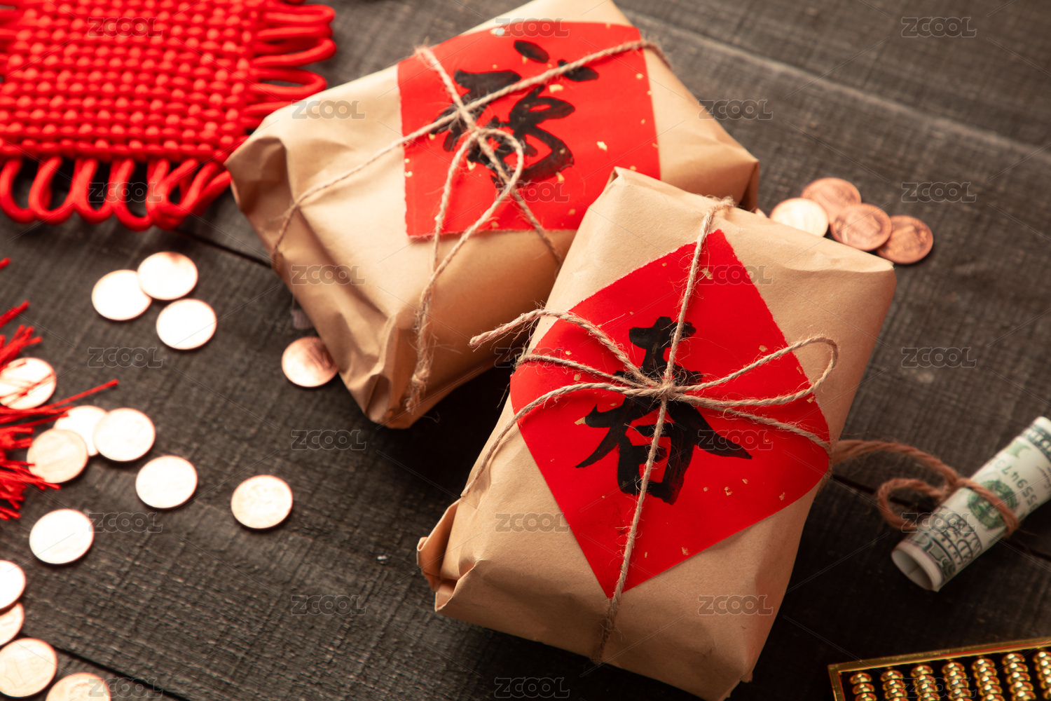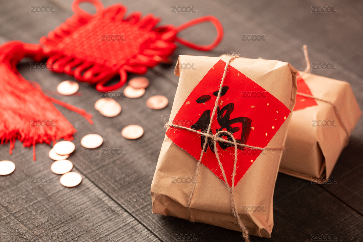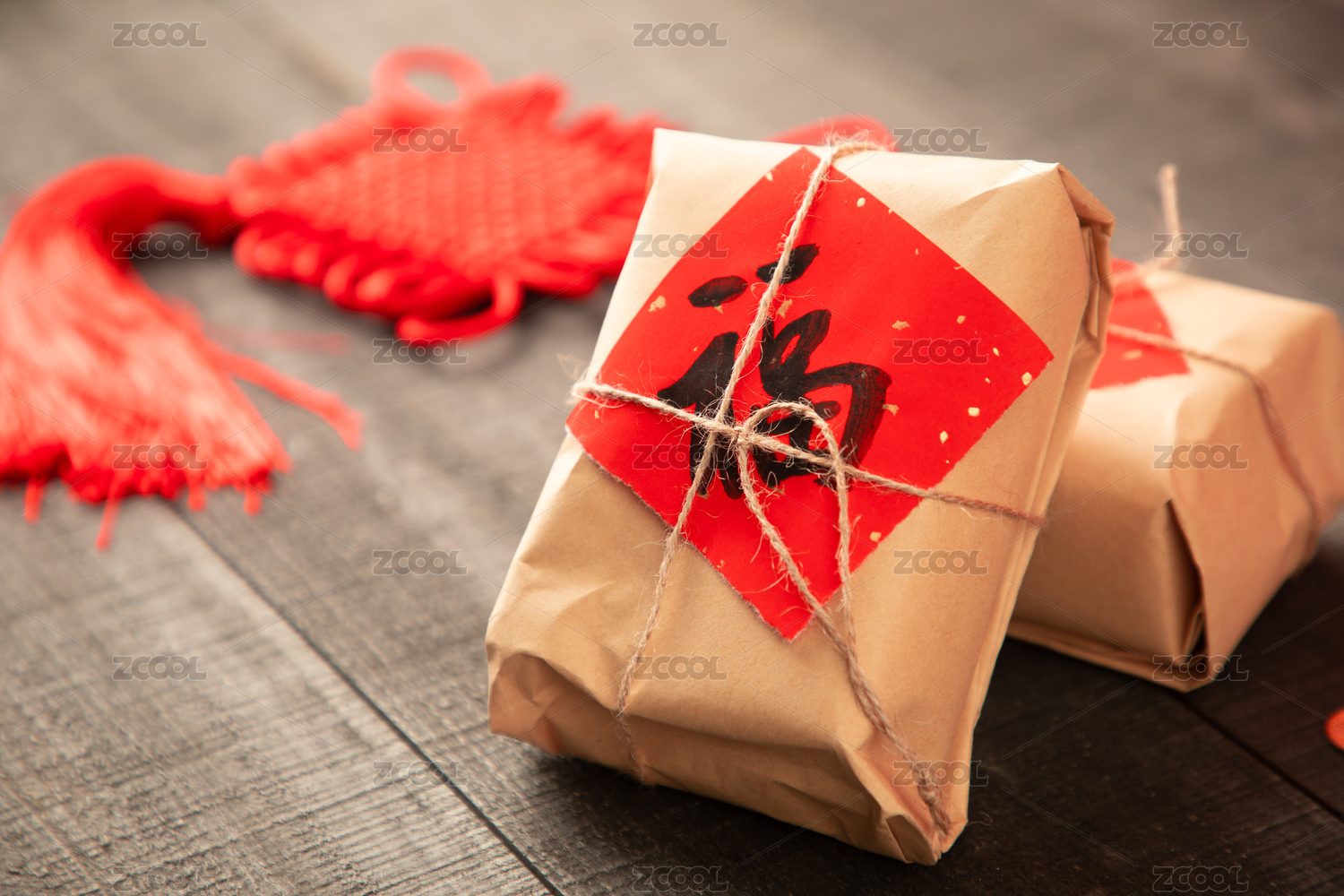 红色喜庆礼品摆放在木质桌面