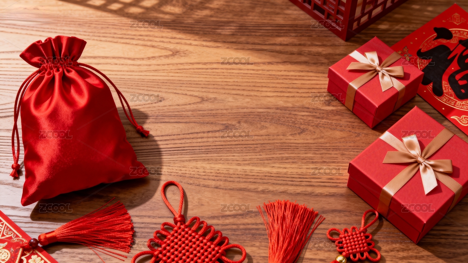 充满中国节日气息的背景下摆放着多个礼品盒及礼品