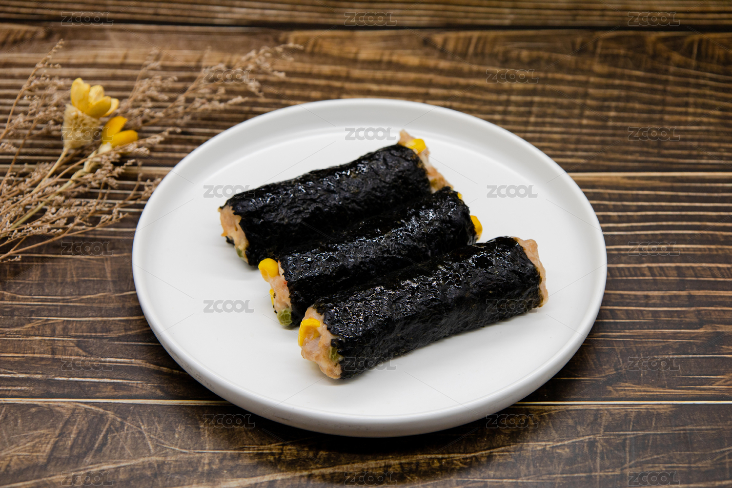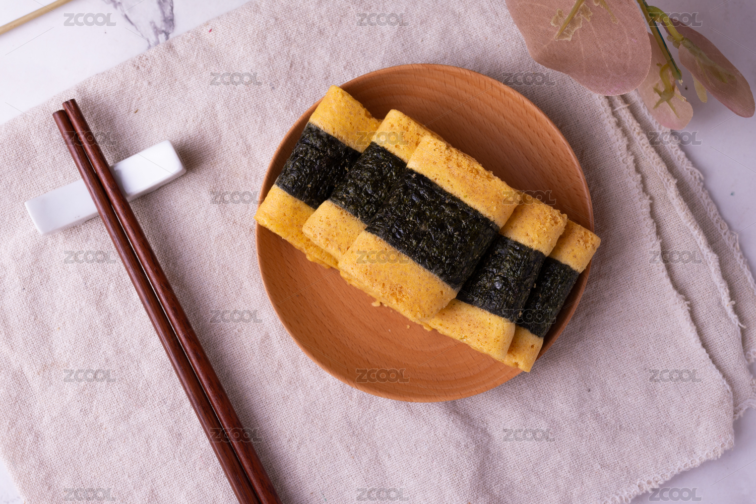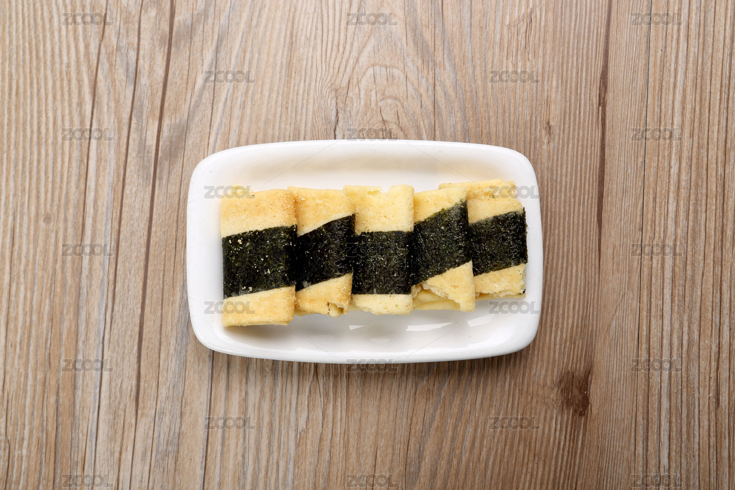 桌面上的白色陶瓷盘子里的紫菜蛋卷
