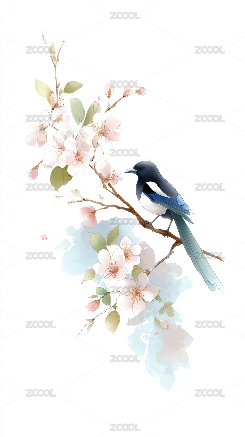 两只喜鹊站在开满桃花的树梢中国风插画