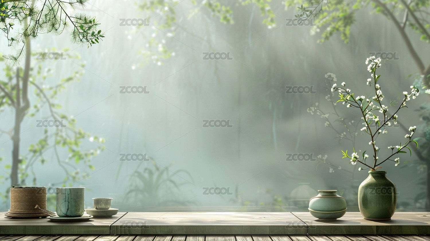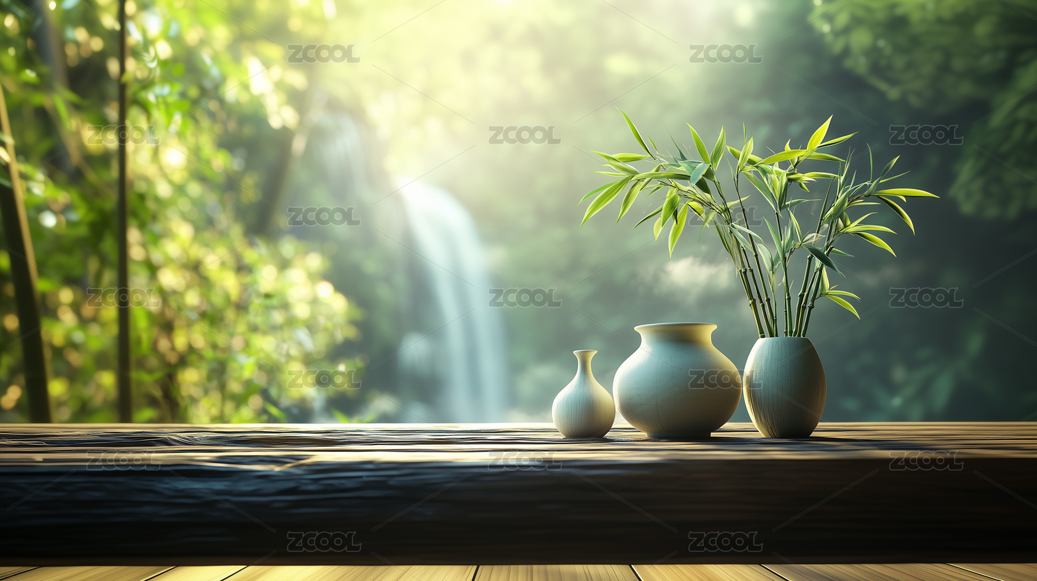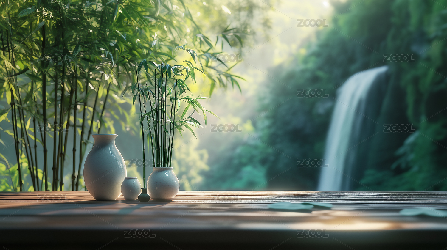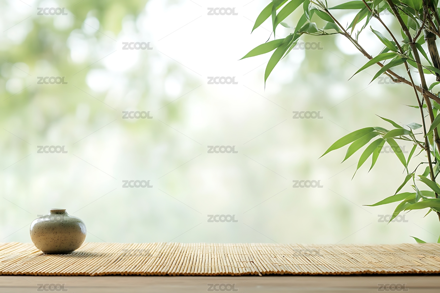 木质桌子,翠绿色,竹子,植物,叶子,优雅,花瓶,白色,浅色,背景