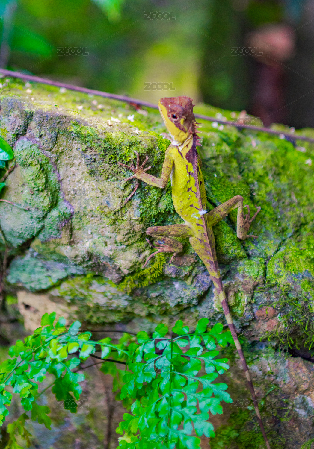 一只蜥蜴(变色树蜥)隐藏在树茎上,颜色和周围环境颜色相似