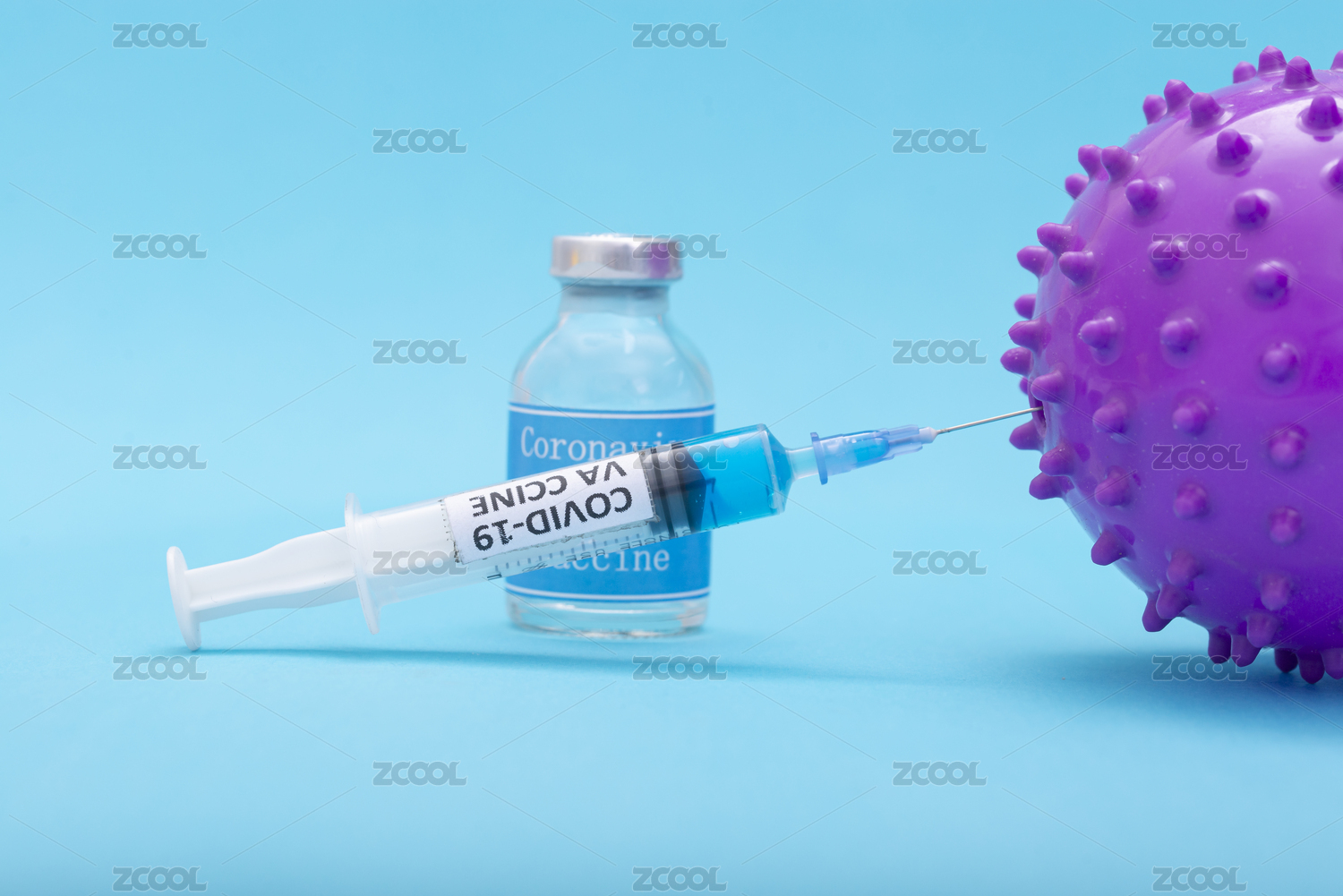 蓝底上的针筒药水及形似病毒的塑料球