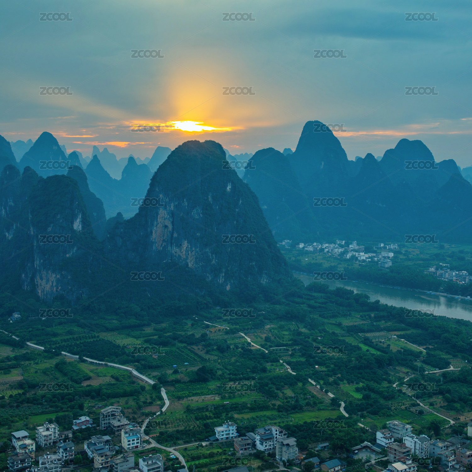 桂林漓江沿岸城市风景自然风光日落晚霞航拍