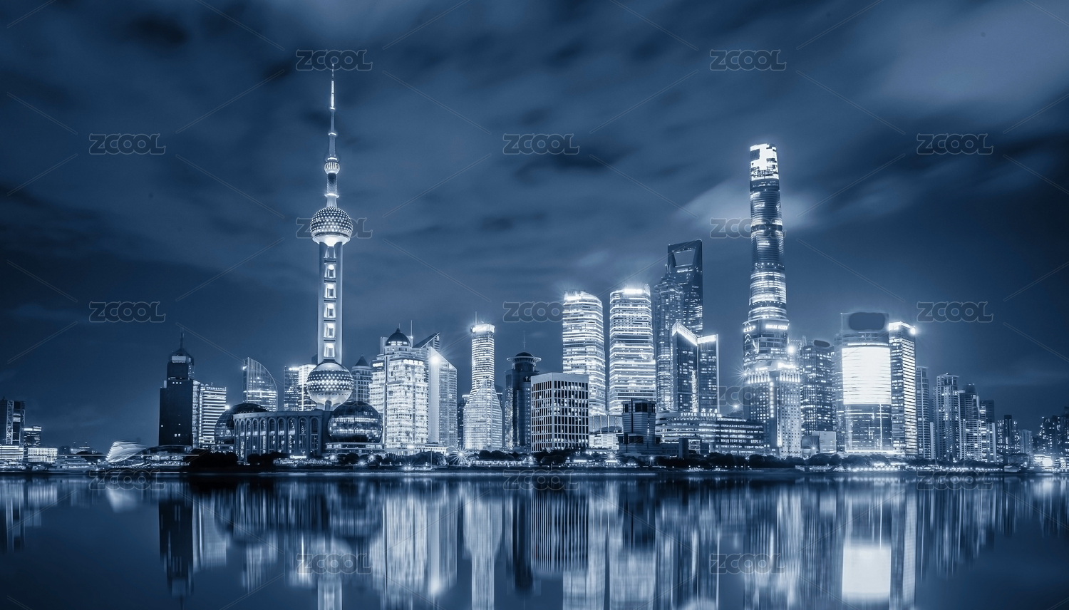 蓝调时分黄浦江畔陆家嘴城市建筑夜景风光,中国上海