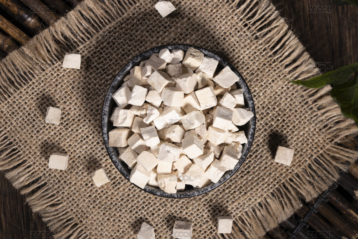 中式复古场景中装在木碗中的茯苓块