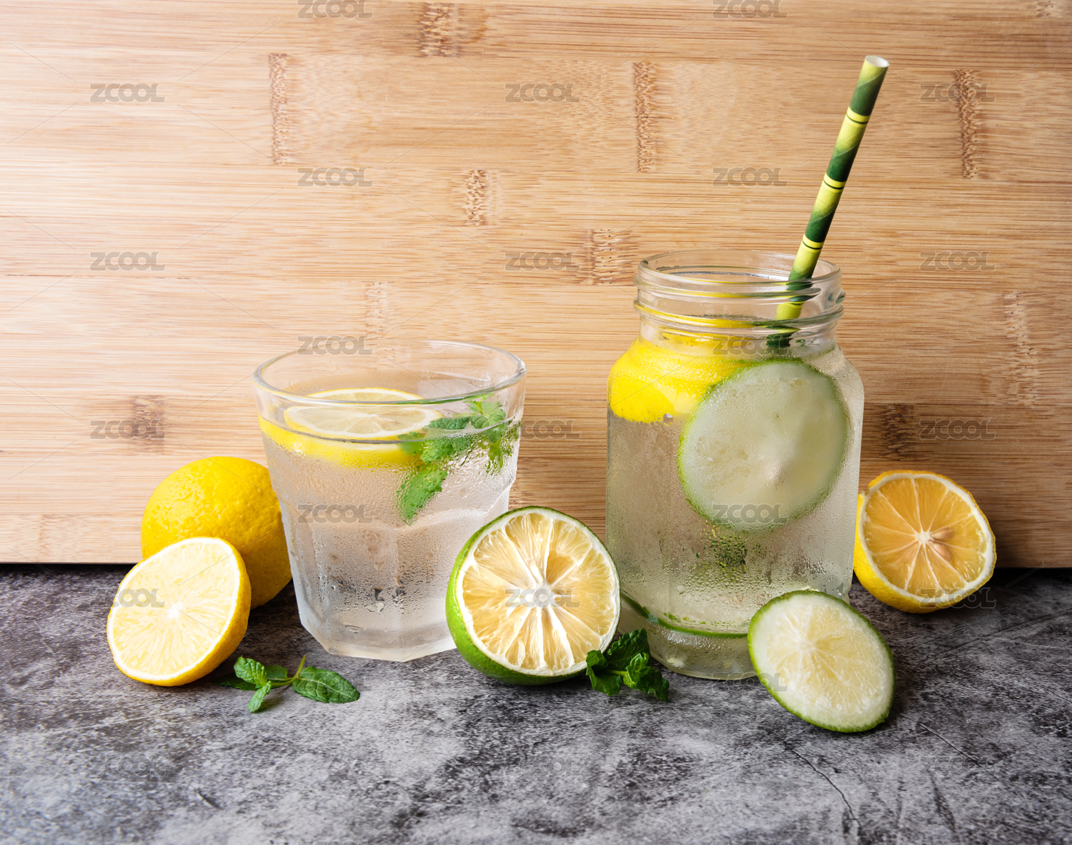 黄瓜柠檬茶和新鲜柠檬果及冰块和薄荷叶
