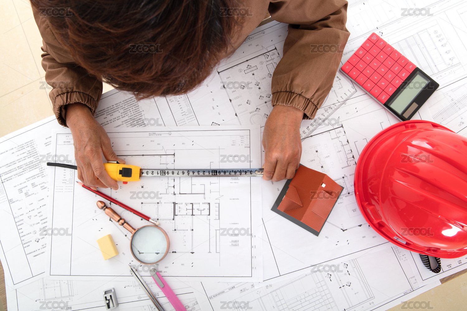 在办公桌上画图纸