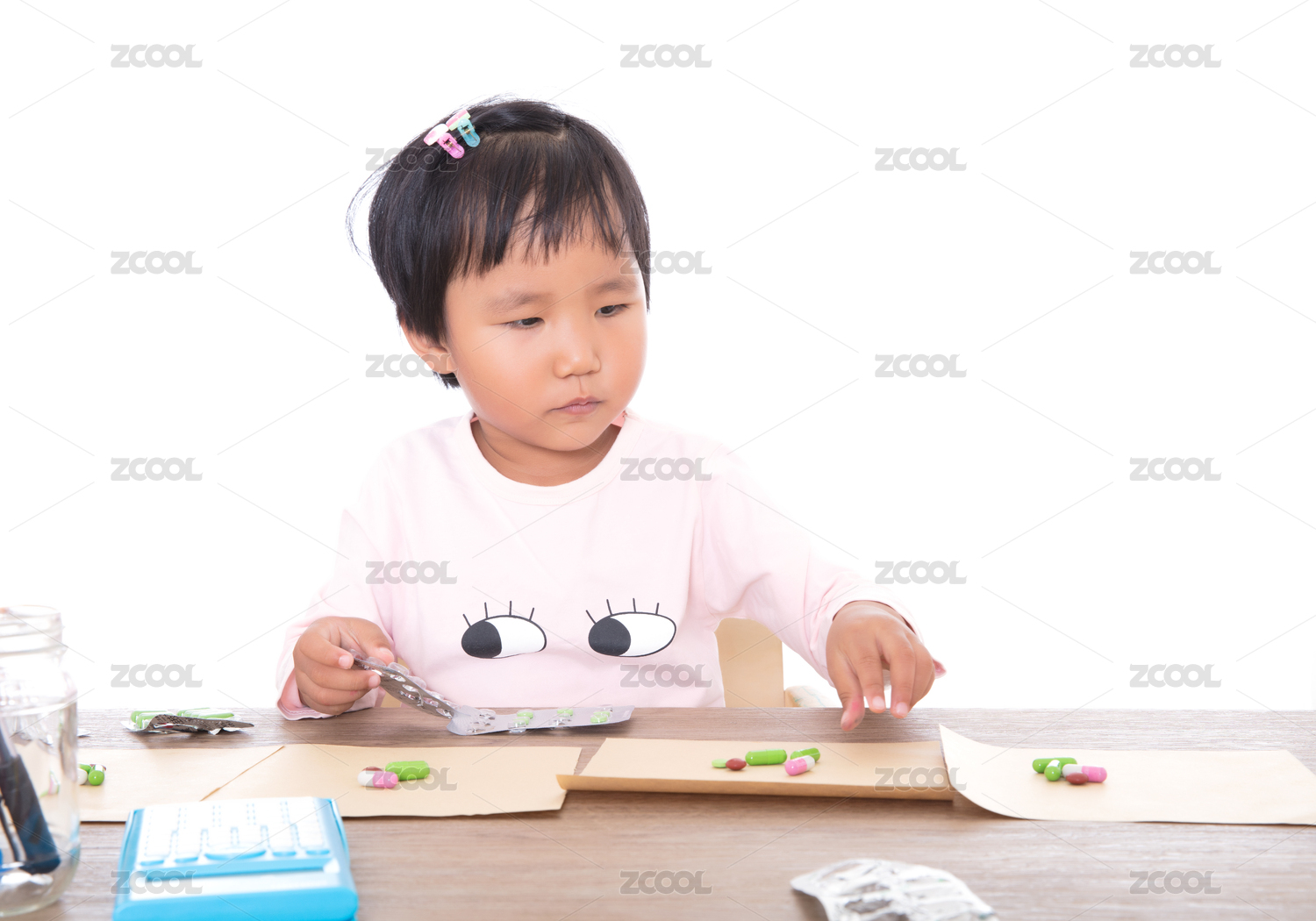 白背景前的桌子上中国小姑娘扮演大夫在配药