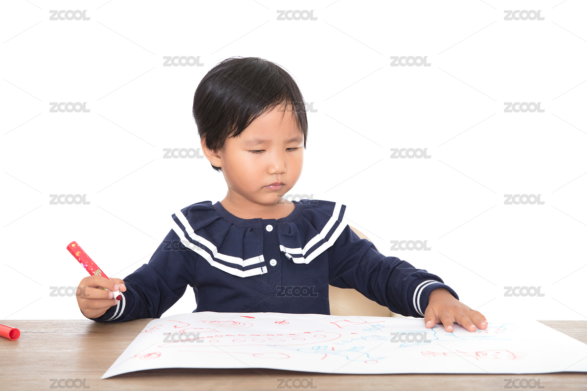 白背景前趴在桌子上手拿画笔画画的中国女孩