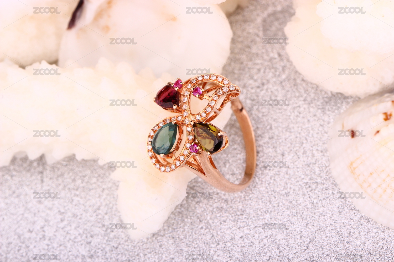 彩色宝石钻戒放在带有白色珊瑚的背景里