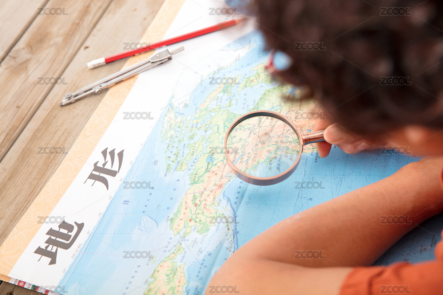 一只手拿着铅笔另一只手拿着放大镜在地图上找寻