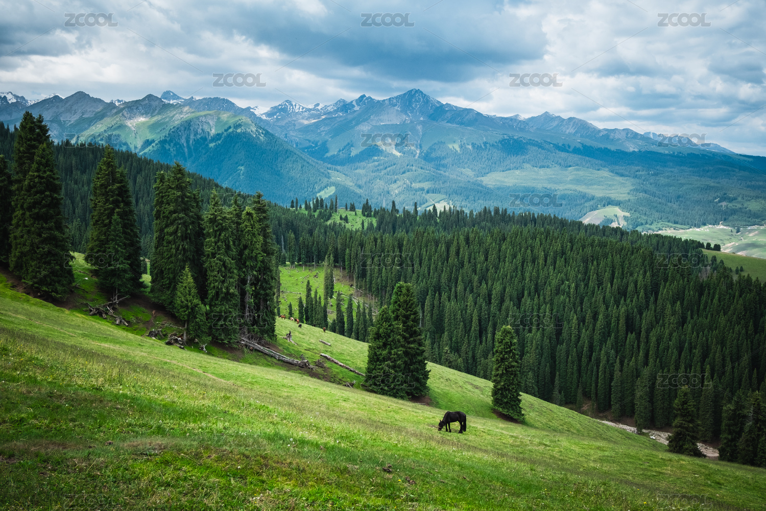 中国新疆伊犁哈萨克自治州昭苏县夏塔古道夏季云杉和骏马