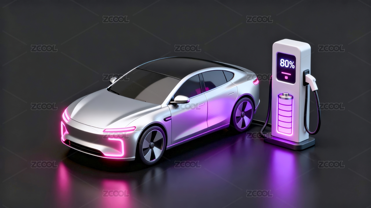 黑底充电桩充电的电动汽车3D卡通立体插画