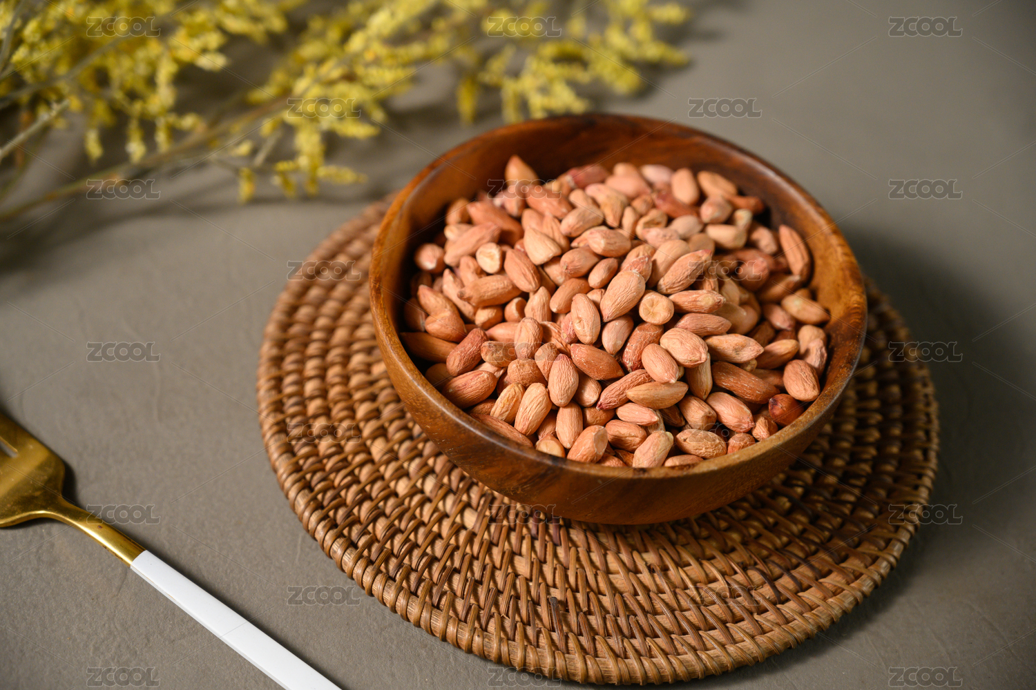 复古中国风格背景上放在碗里的红皮花生米特写图片