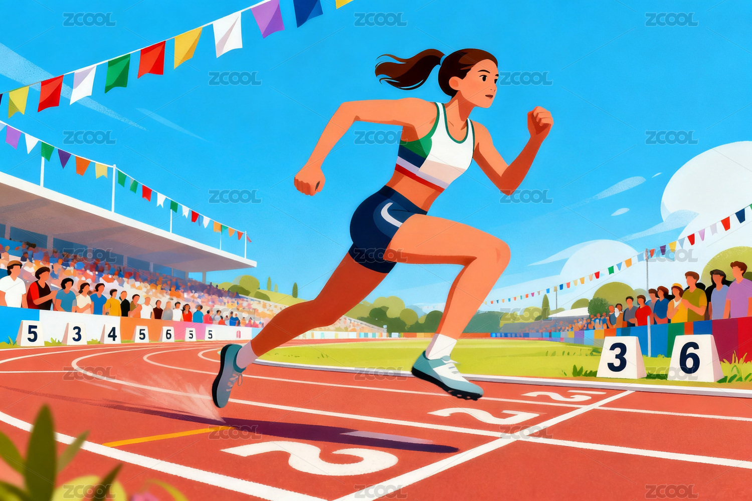 矢量扁平运动场跑道上跑步的运动员场景插画
