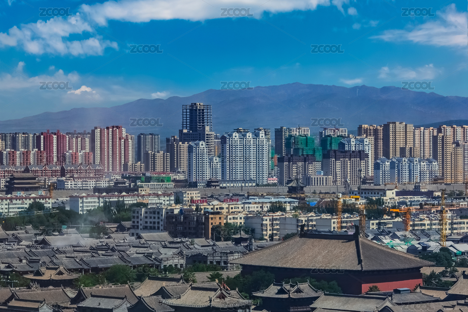 中国内蒙古呼和浩特大召寺和远处的高楼建筑