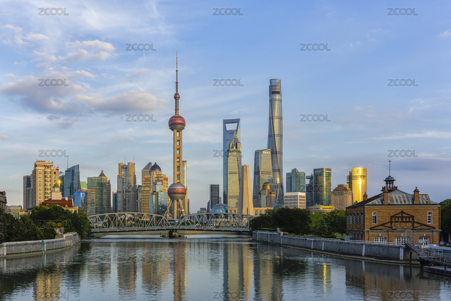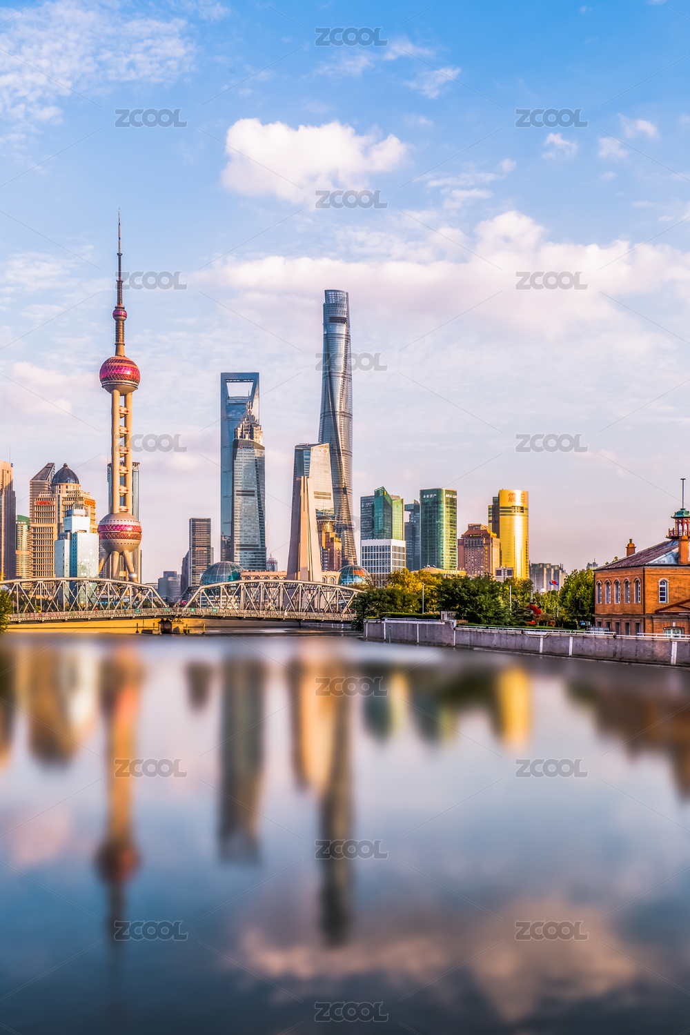 在上海虹口北外滩,遥望陆家嘴CBD建筑群