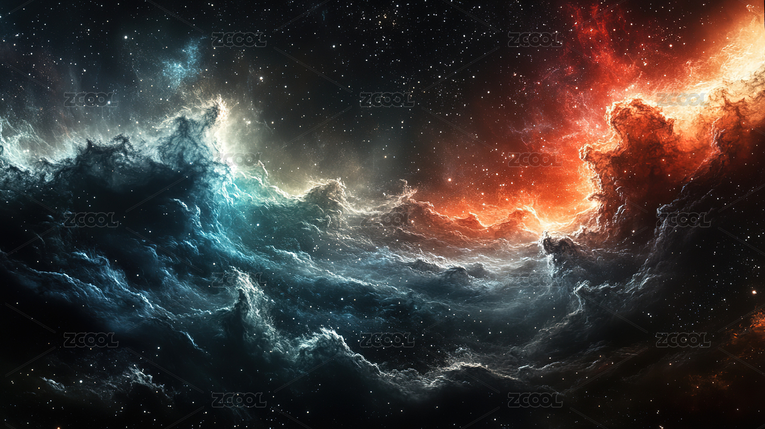 五颜六色的宇宙星云笼罩在太空尘埃中,天体