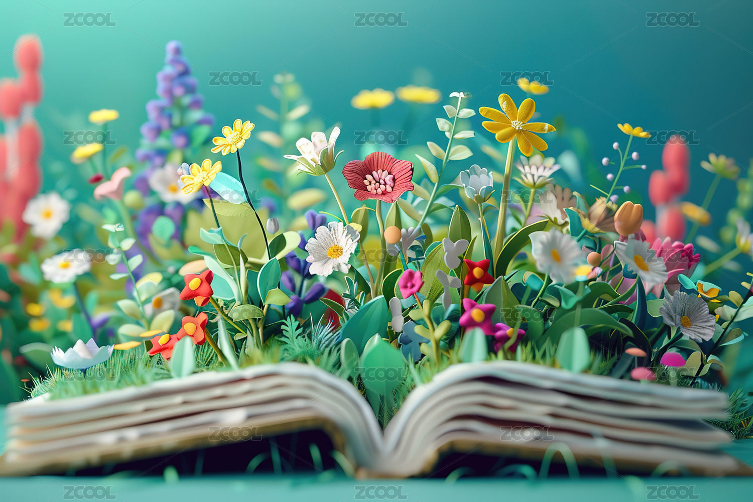 3D卡通打开的书本植物花朵背景