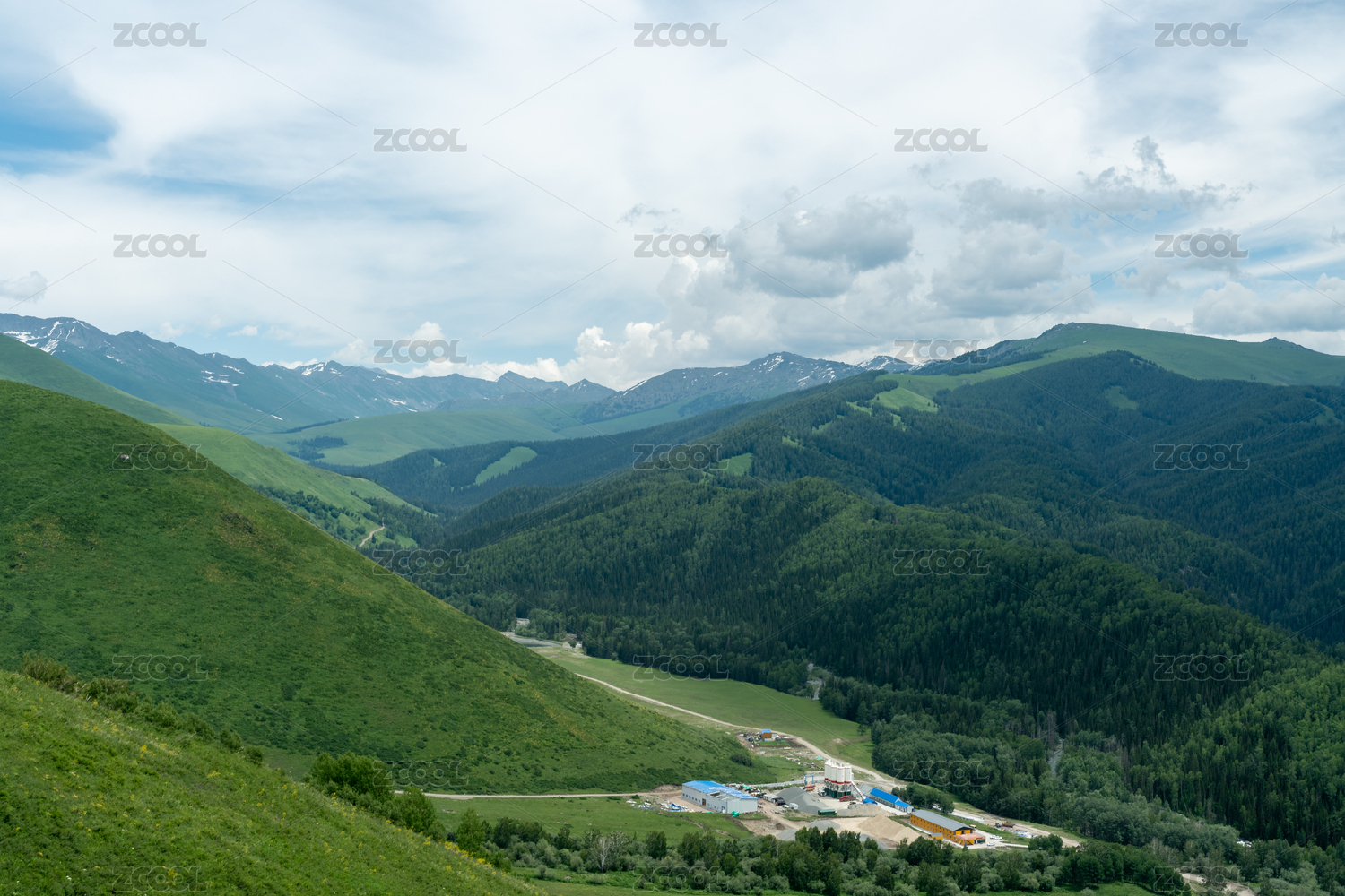 中国新疆下塔风景区雄伟的山脉和绿色的草原
