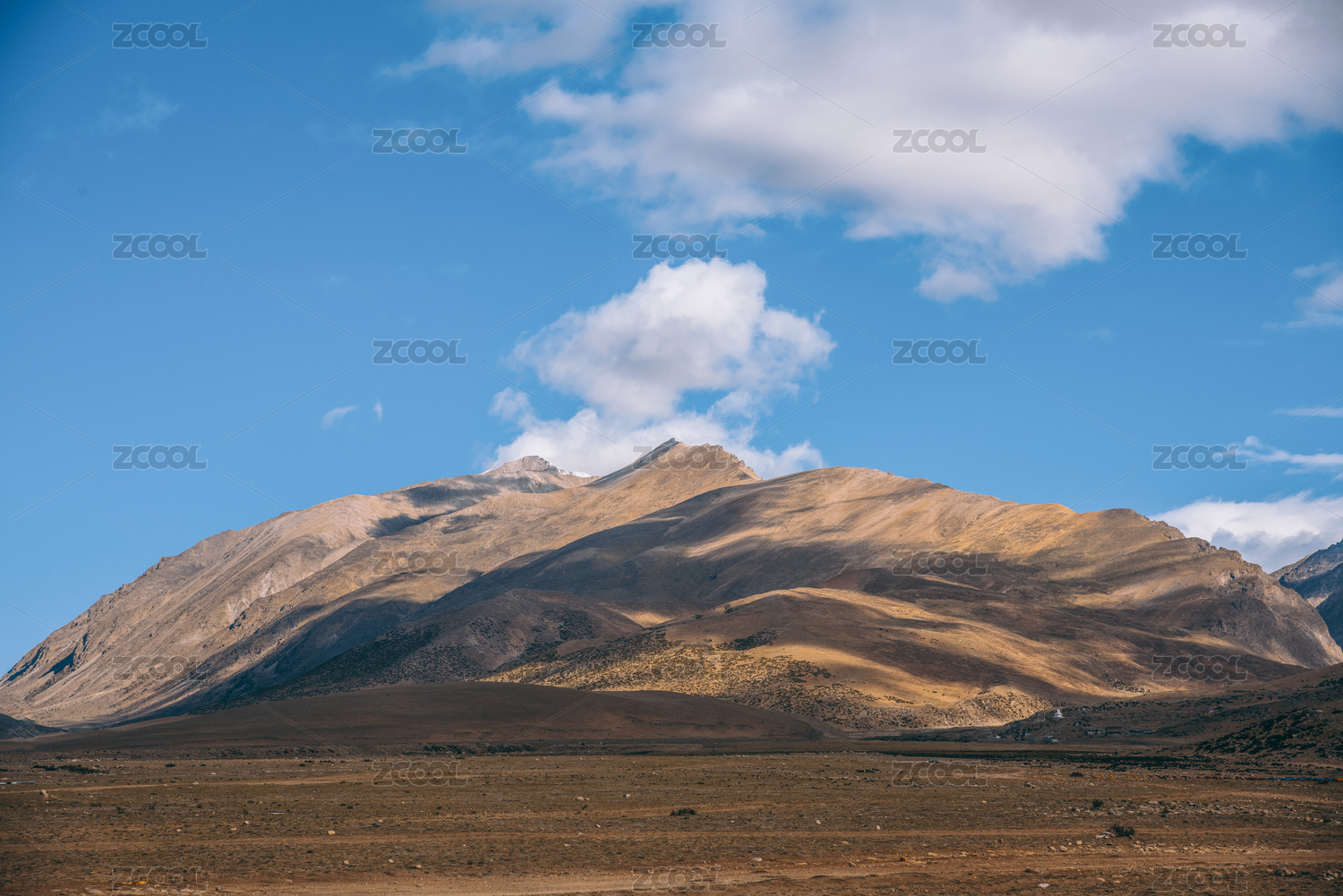 中国西藏藏族自治区318国道五月的远眺群山白云与荒野村庄