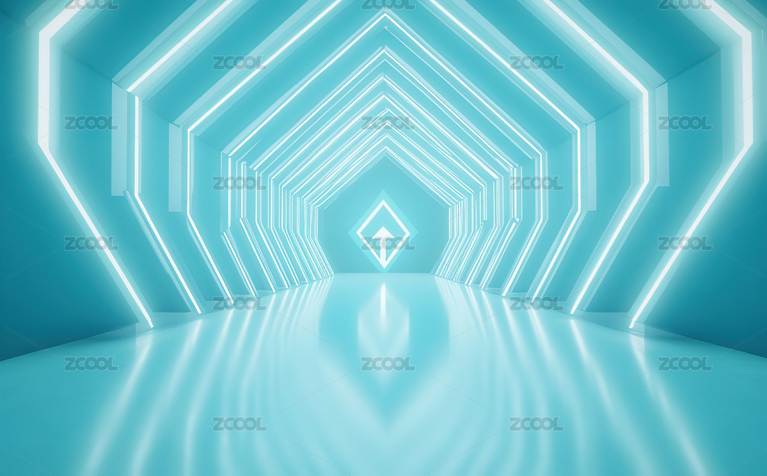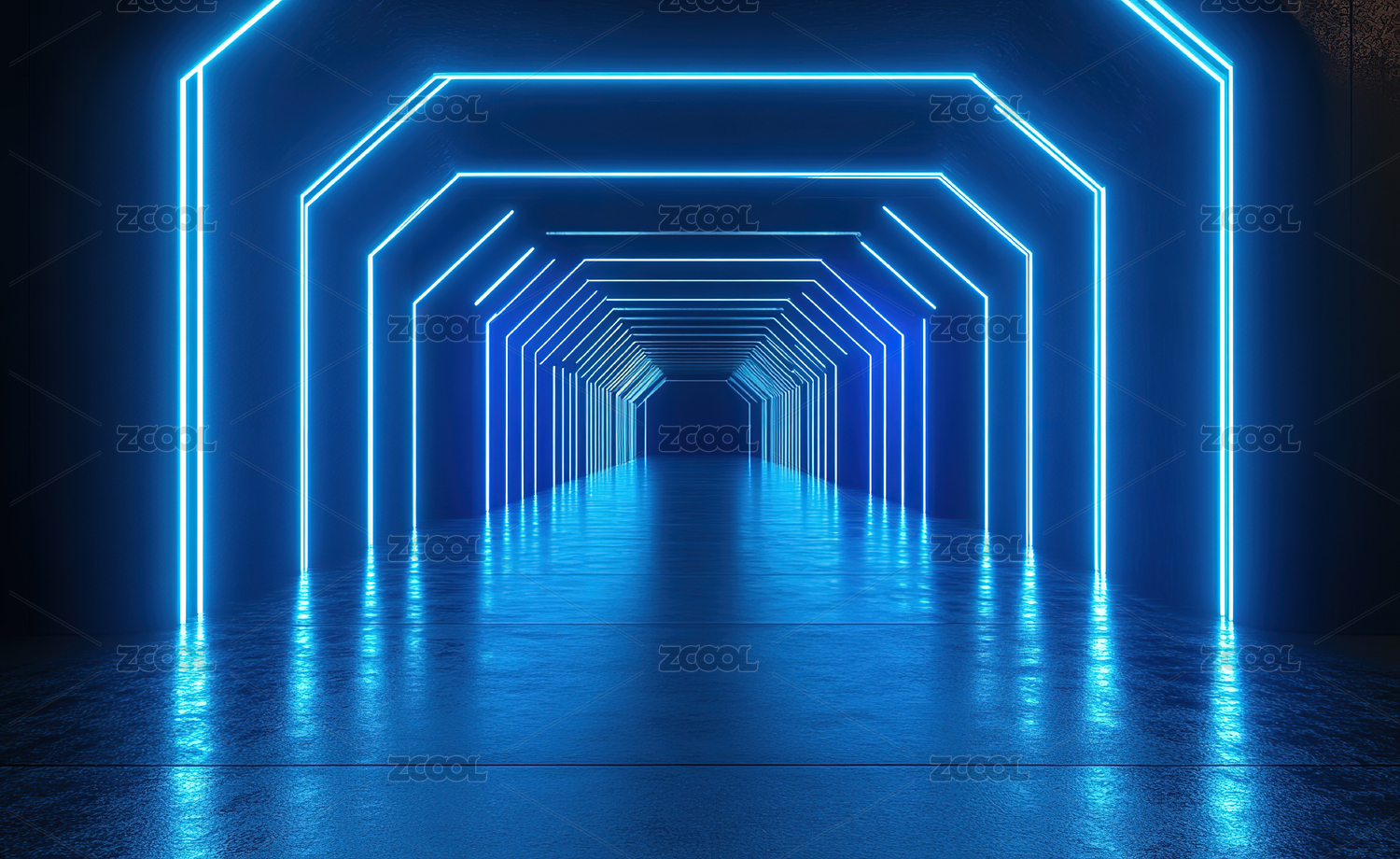 未来感深蓝色调与霓虹灯矩形框架室内场景