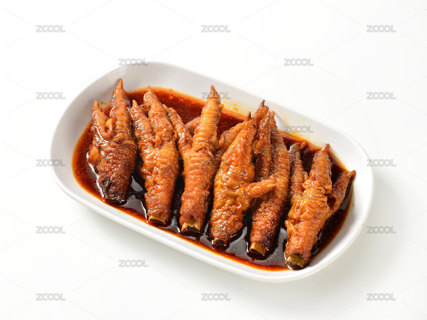 白圆盘里的辣味卤制鸡爪凉菜卤菜