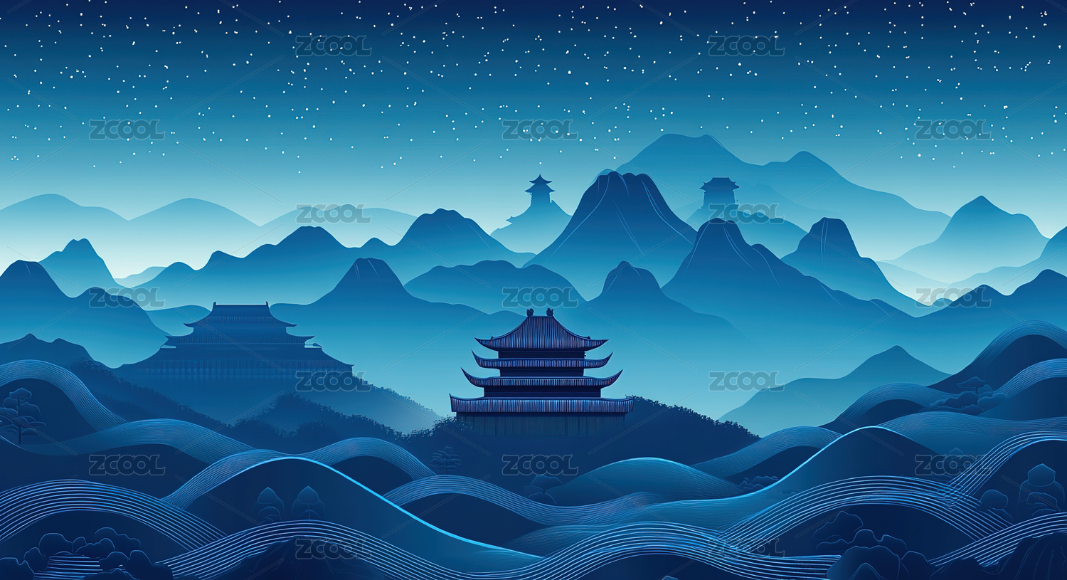 国潮风格中式古代建筑宝塔亭台楼阁远山祥云