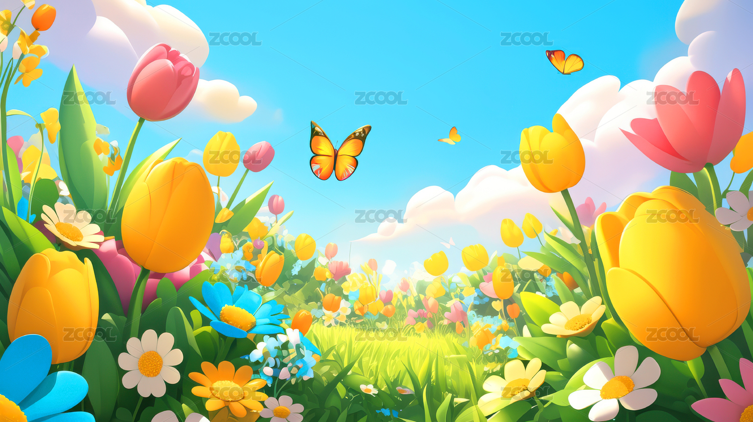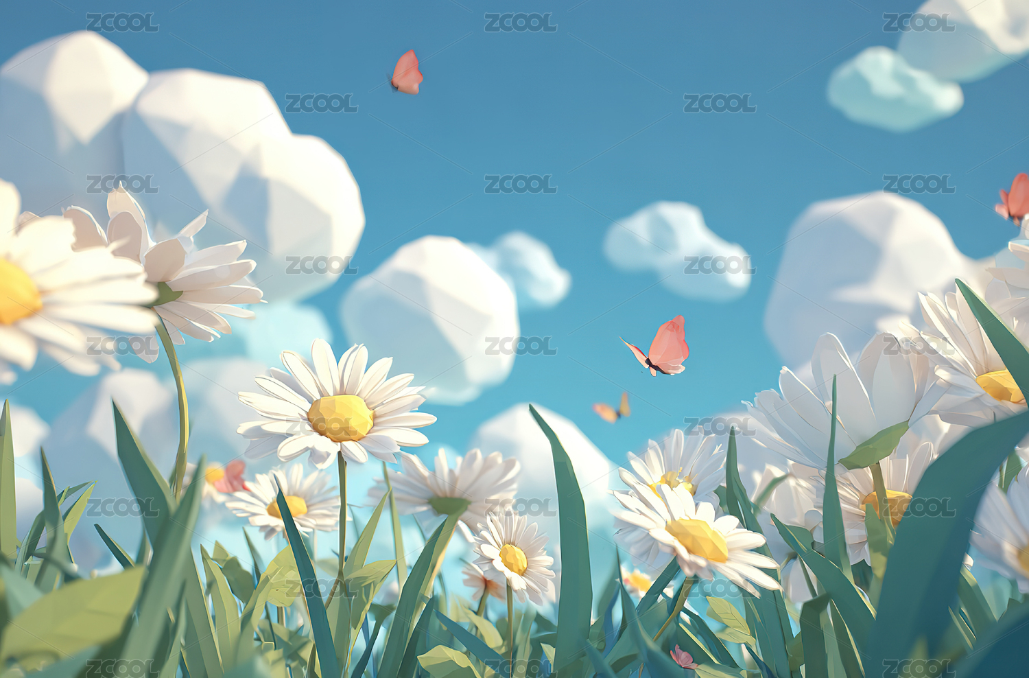 蓝天白云下草地上开着花朵蝴蝶在飞