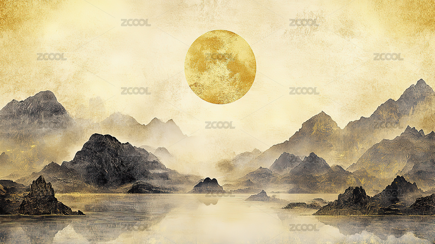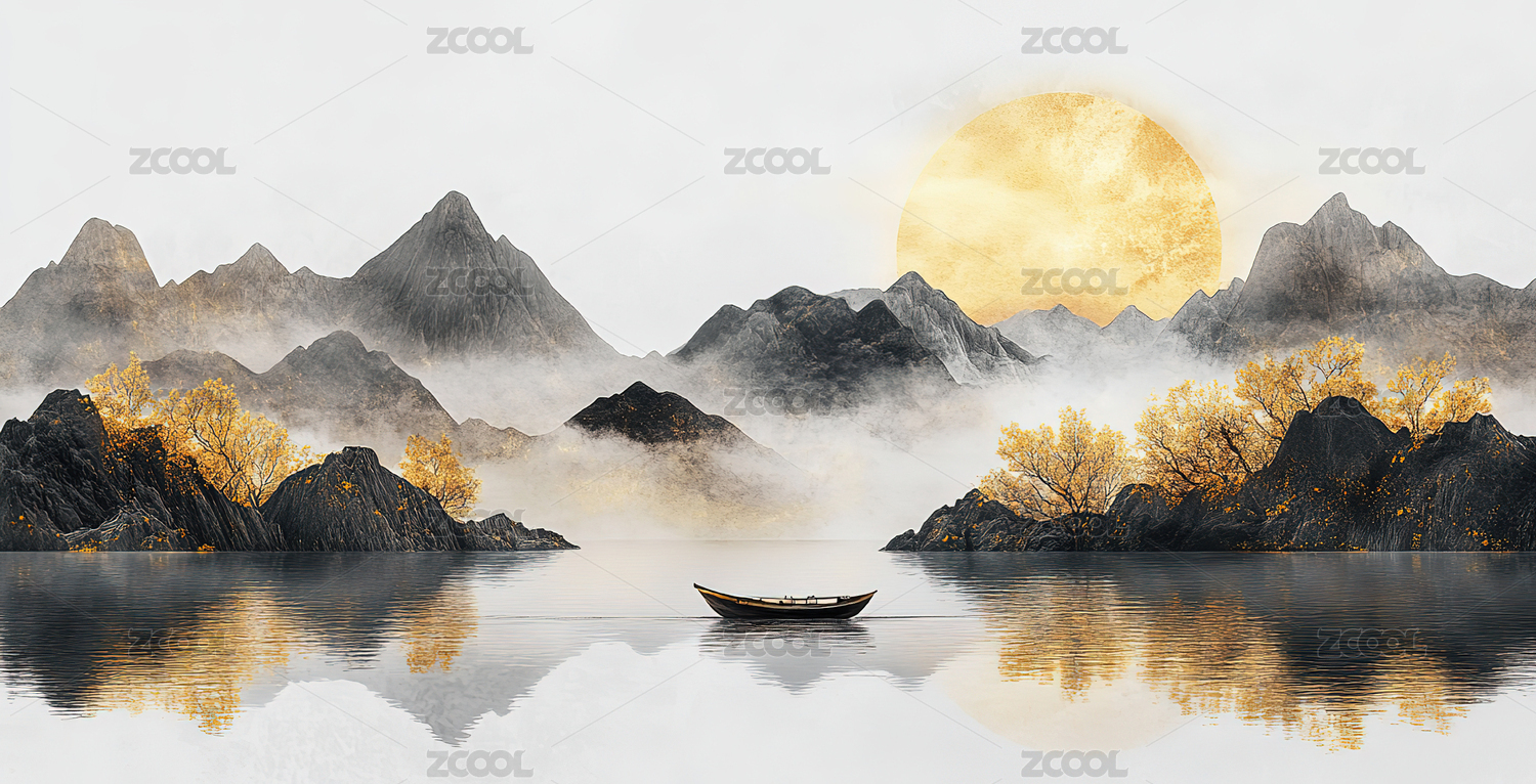 金色中式水墨山水风光画