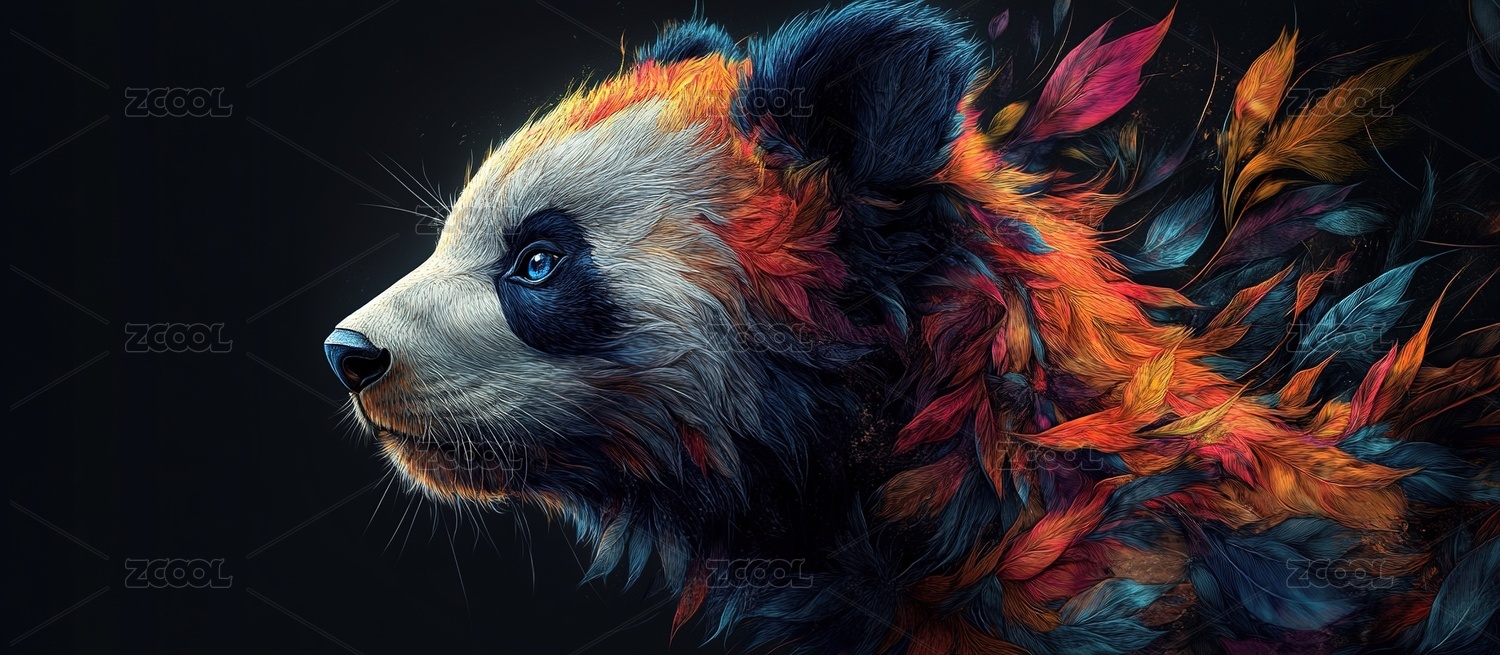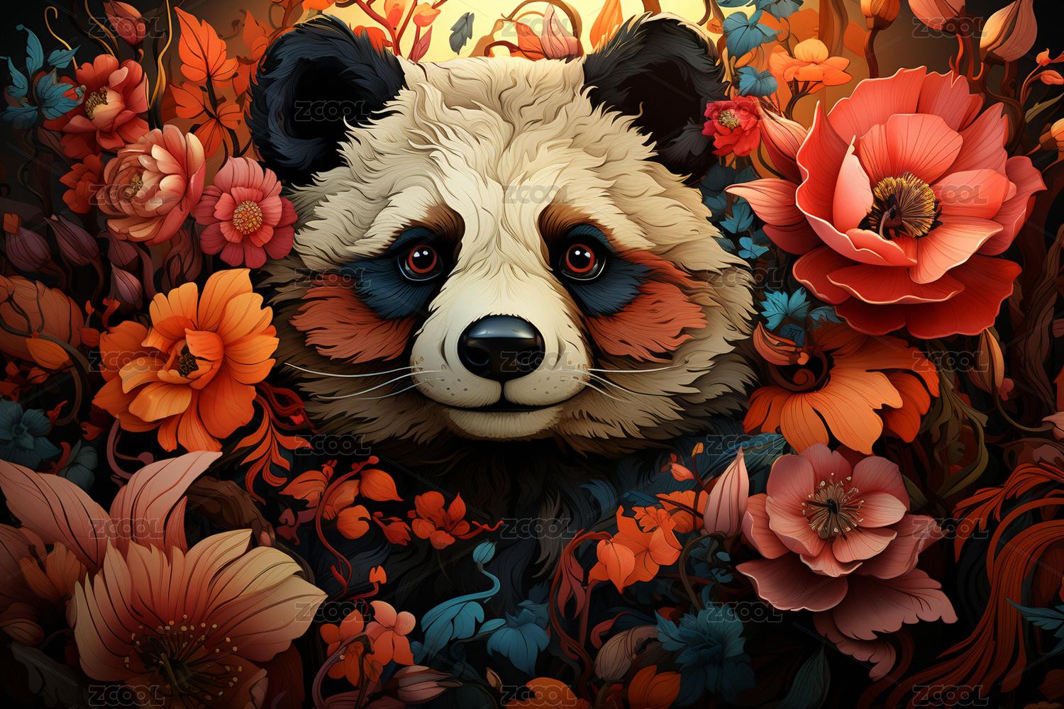潮流插画风格鲜花熊猫水彩画